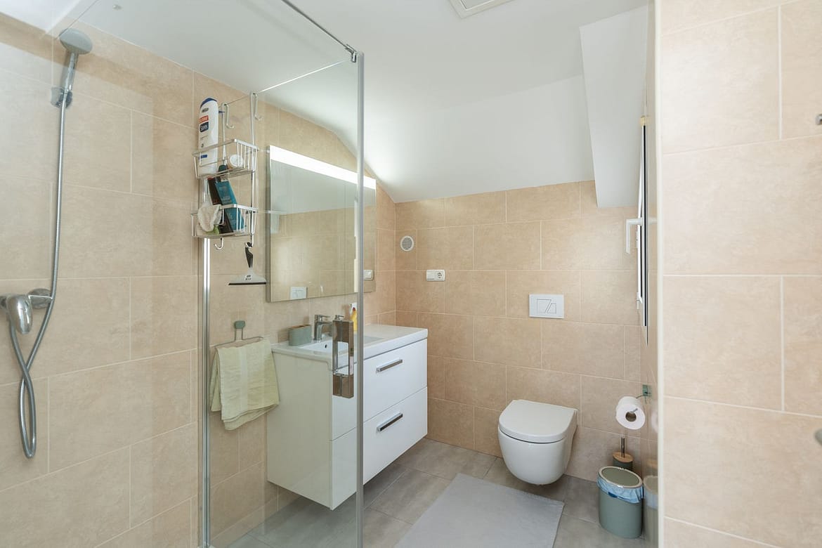 On the ground floor, there are three bedrooms, including one with an en-suite bathroom, and a second fully equipped bathroom that has been adapted with a shower and bathtub accessible for people with reduced mobility. The two front bedrooms open onto a large terrace, while the third bedroom connects to a rear terrace where a professionally installed sauna offers both traditional and infrared options. All bedrooms feature electric blinds installed recently. From this level, the main entrance intercom is also controlled, providing convenience and security.