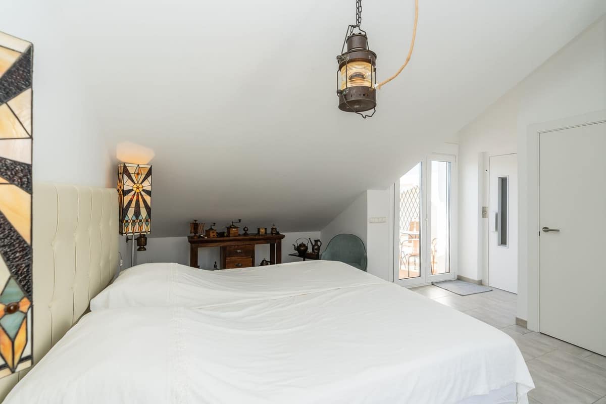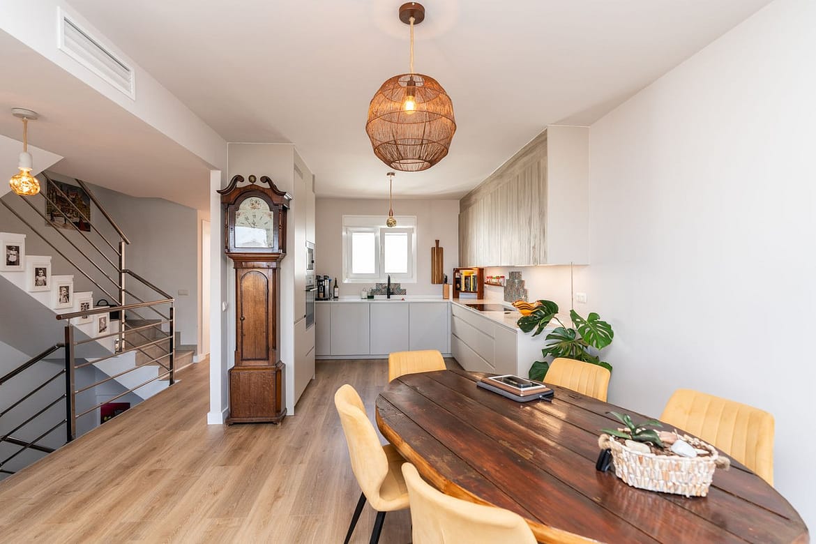The first floor houses a bright open-plan space where the newly renovated kitchen flows seamlessly into the living and dining areas. The high quality laminate floors have also been recently updated. The kitchen features a 90 cm ceramic hob capable of accommodating five pots, as well as a high-end Qooker smart tap that supplies boiling, cold, or sparkling water directly from a single faucet. From the living room, you can access a terrace with sea views — perfect for enjoying the Mediterranean surroundings — and there is also a guest WC.