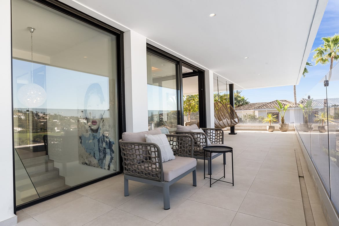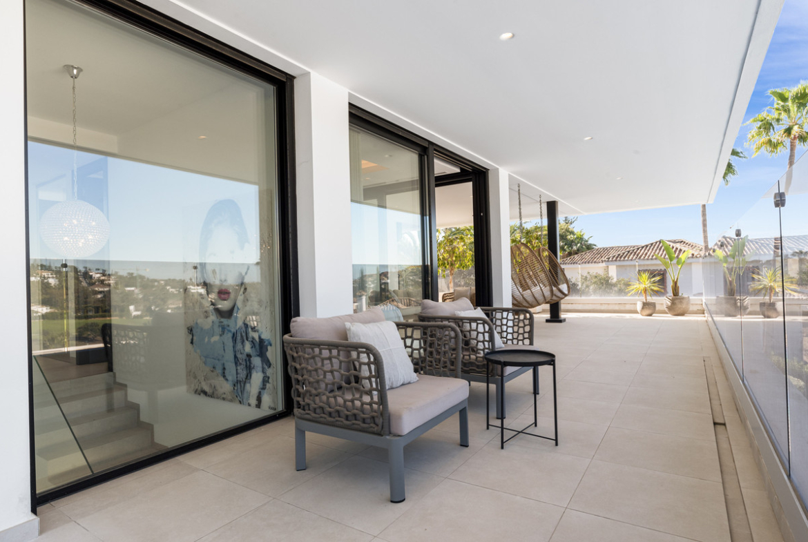 Additional features of this luxury villa include a guest toilet, a private terrace, and a covered terrace with electric blinds. The property offers panoramic views of the sea, mountains, and golf course, allowing you to enjoy the beauty of the surroundings …