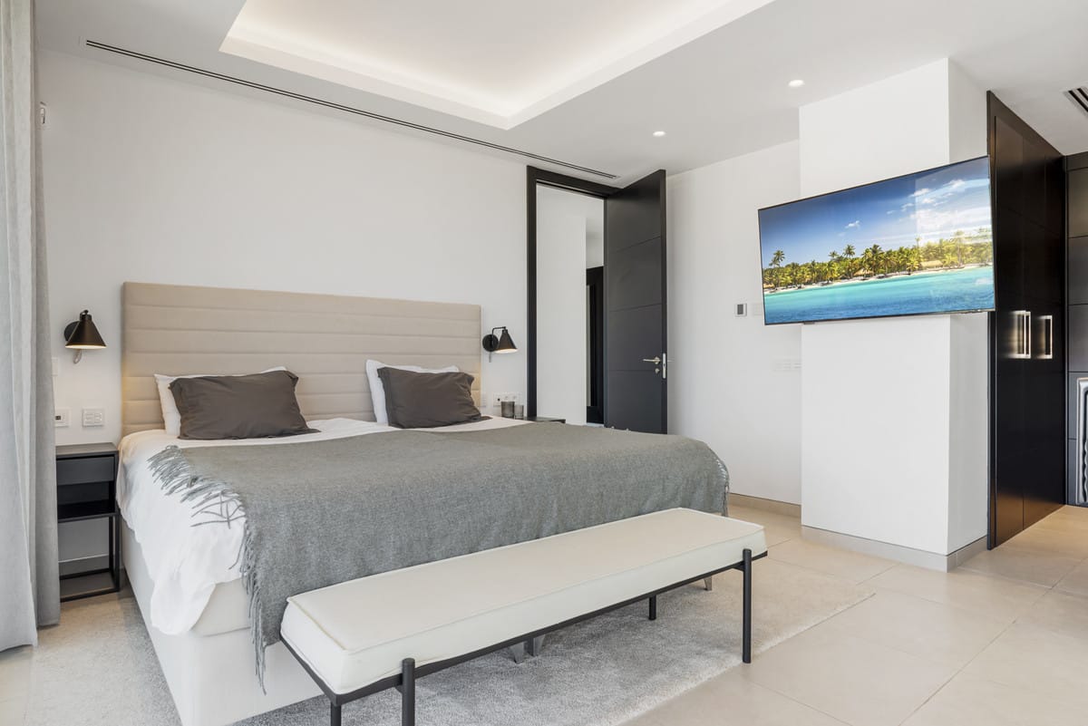 This stunning and modern luxury villa is located in the prestigious area of Nueva Andalucia, Marbella, in the province of Malaga. With its prime location, this property offers breathtaking views of La Concha and the sea. The villa boasts 5 spacious bedrooms and 4 elegant bathrooms, making it the perfect home for a large family or those who love to entertain. One of the rooms has 3 Bunk beds, 6 beds total in that room.