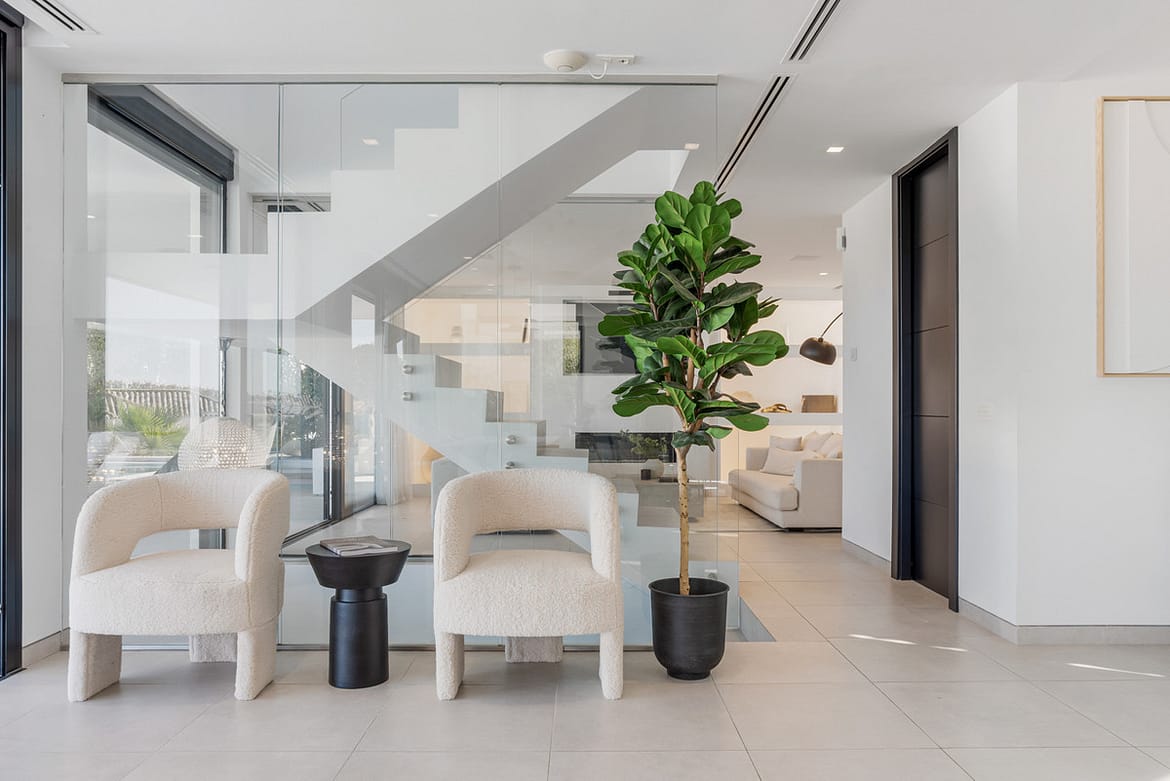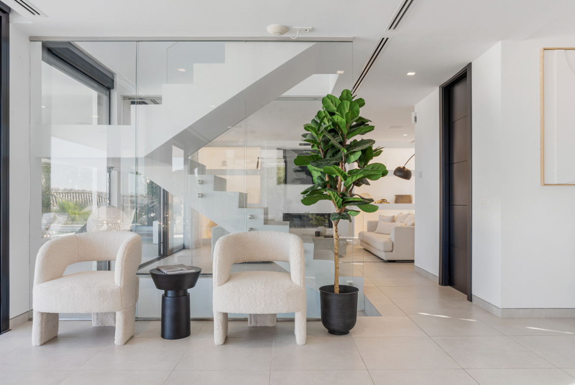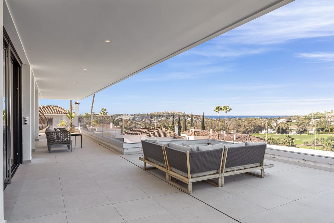 Additional features of this luxury villa include a guest toilet, a private terrace, and a covered terrace with electric blinds. The property offers panoramic views of the sea, mountains, and golf course, allowing you to enjoy the beauty of the surroundings …