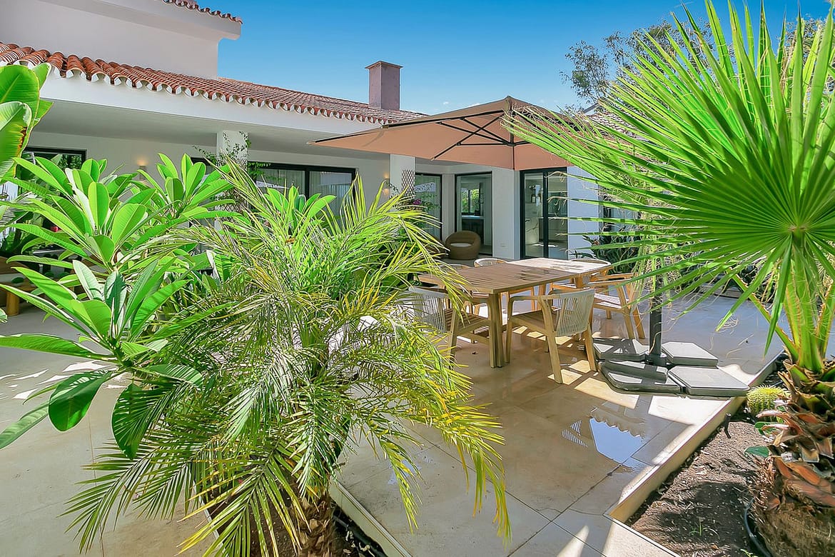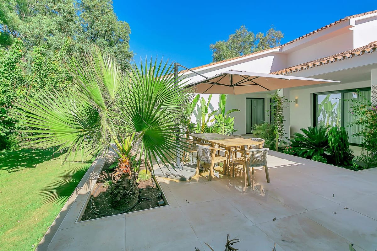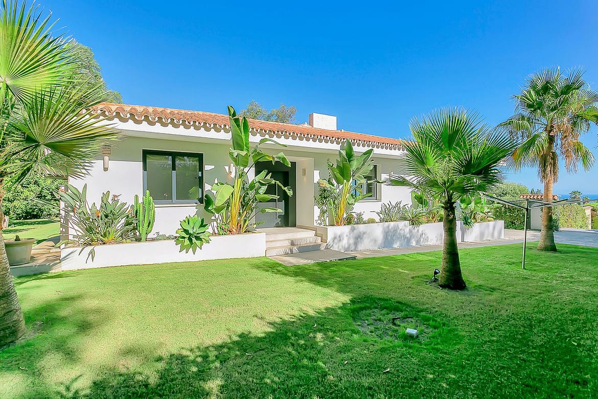 Without exception the most beautiful and private villa in Cabopino. This wonderful 5 bedroom luxury home is an astonishing blend of Andalusian authenticity and immaculate contemporary comfort. Located in a very discrete cul-de-sac, the property is accessed via a private driveway leading to automated gates which open on to the expansive lush gardens within which this amazing home is situated. Access to the front door is via an easy paved pathway making entrance with suitcases and other holiday necessities very straight-forward.