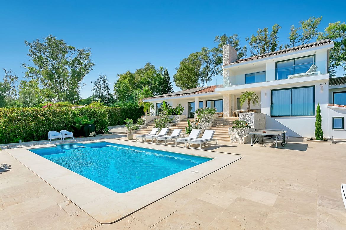 The villa sits elevated above it's enormous swimming pool, giving very spectacular sea views from all parts of this home. The first impression on arrival at this luxury Marbella East holiday home will take your breath away. Light, views, space, style and comfort….all in great abundance. Enter the gardens, close the gate and relax inside your own private and secure paradise. Surrounded by blooming tropical and Mediterranean foliage, and with multiple terraces both the front of the villa overlooking the pool with sea views, and the rear of the villa, the stunning covered terrace giving shade in the hot summer months or extra cosiness in the cooler winter months, there is little left to be desired in this immaculate and bespoke holiday home.