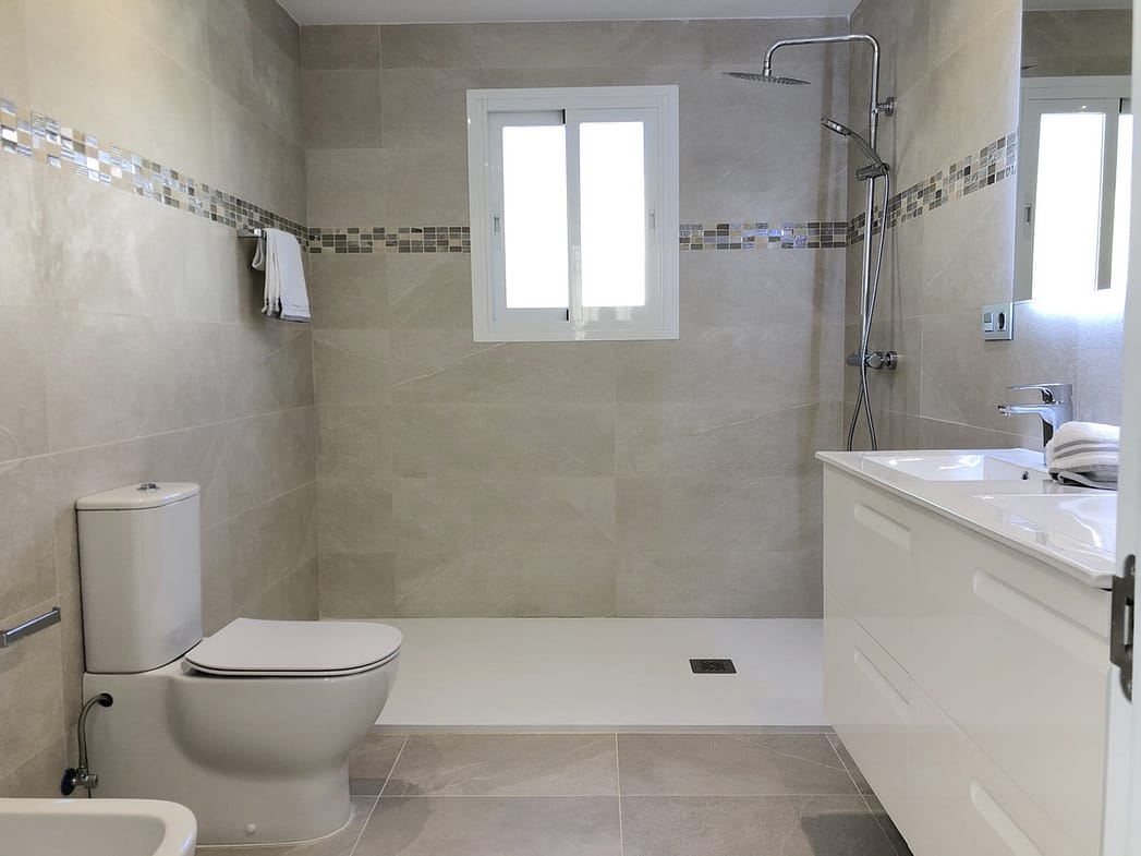 Villa Monterray comprises 5 large bedrooms and 4.5 bathrooms. There are two master suites situated on the first floor, both with walk-in closets and en-suite bathrooms and their own private access to the enormous terrace with stretching ocean views and a quirky, rustic thatched-roof lounge area. One of the master suites also has a separate small balcony overlooking the garden. Three bedrooms are located on the ground floor, one en-suite with direct access onto the front terrace and one which shares a bathroom with bedroom 5 with direct access onto a quaint courtyard with a beautiful ceramic mural and in-built, tiled seating under an arch of bright pink flowers, perfect for some quiet afternoon reading. Bedroom 5 has a large window with views onto the side garden, filled with lemon and lime trees.