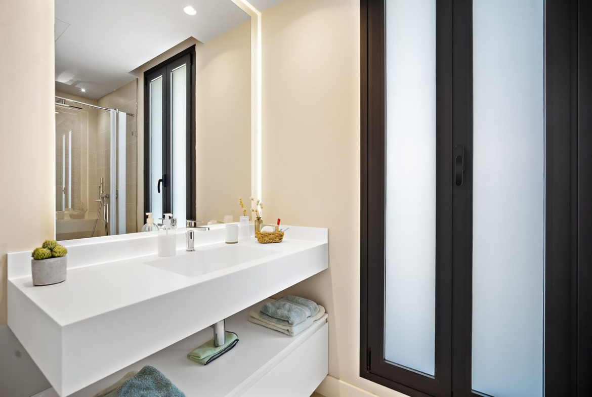 On the ground floor, you will find a spacious lounge with a cosy dining area alongside with direct access to the terrace. The dining area is connected to the open kitchen which offers the laundry room and separate toilet behind it. On the first floor you have 2 beautifully decorated spacious bedrooms en suite with access to the first-floor terrace and panoramic sea views. On the min 1 there are 2 more spacious bedrooms with a shared bathroom.
