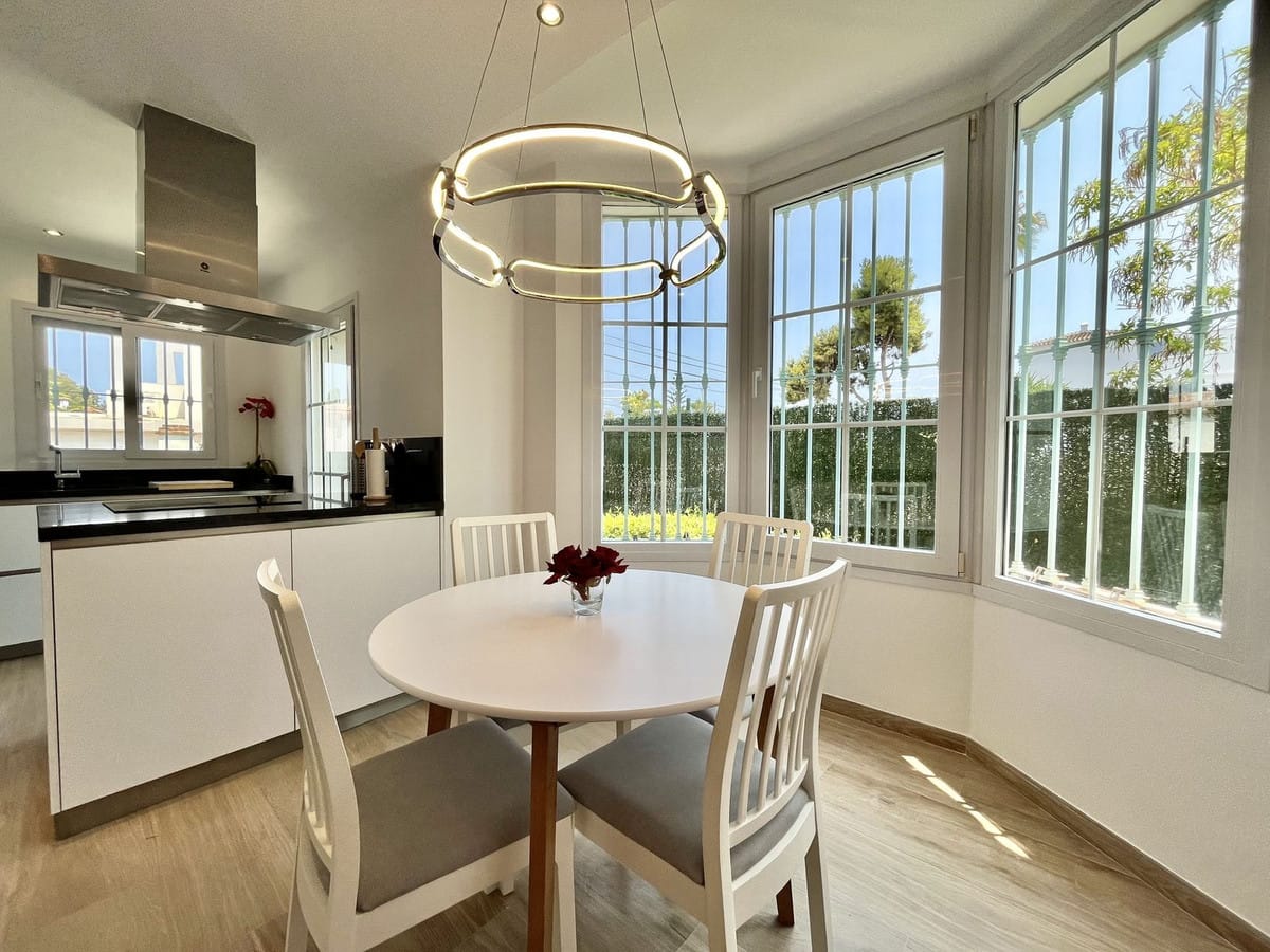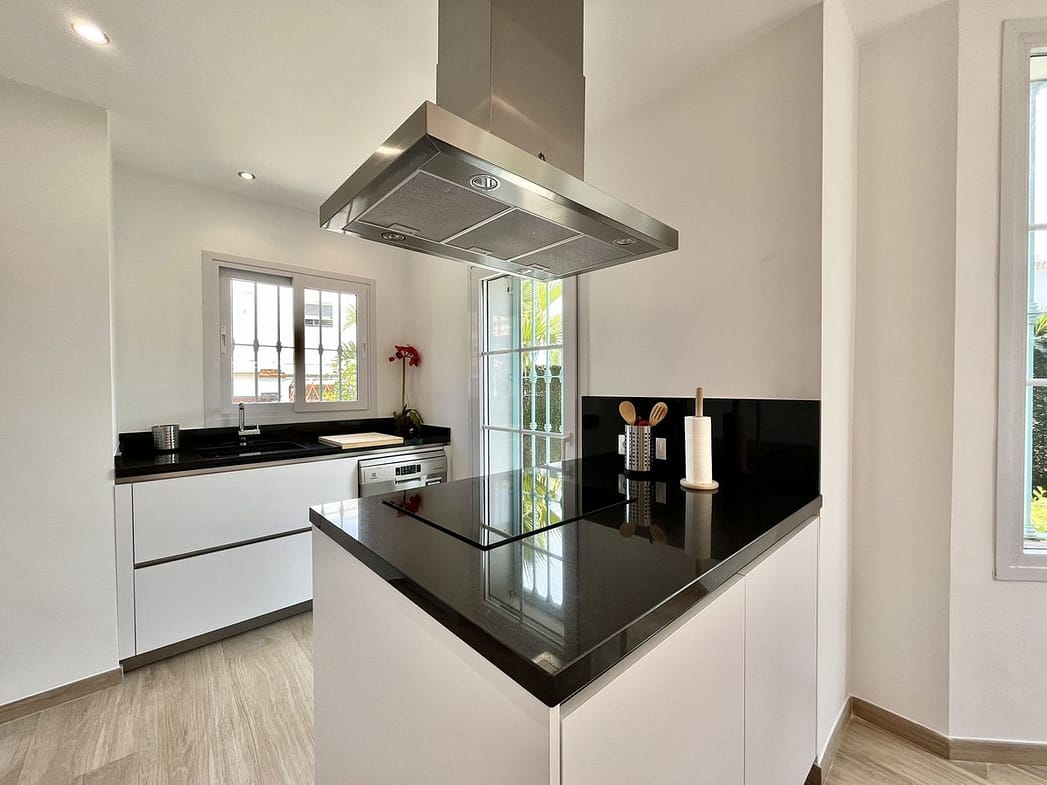 On the ground floor we find the large living room with separate dining area, fully renovated and equipped kitchen, an en-suite bedroom and the guest toilet.