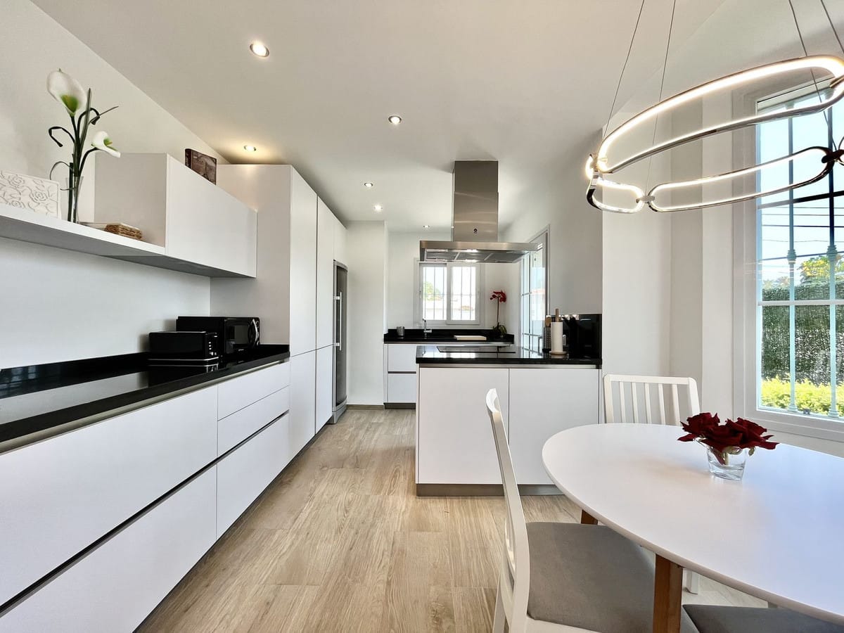The living room leads onto the large covered terrace distributed on two different sitting areas with direct access to the private garden with swimming pool, barbecue and the sunbath area with eight sun loungers.
