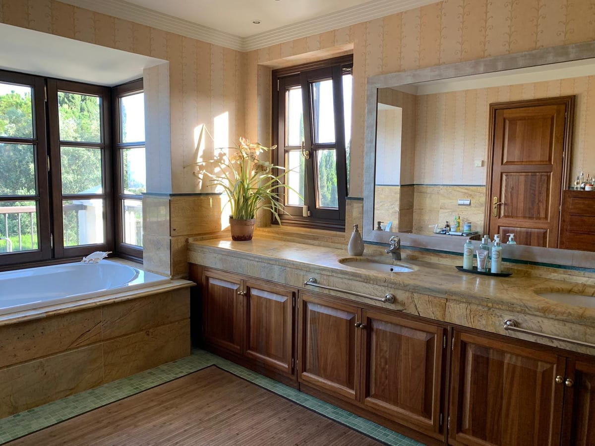 This marvellous five bedroom family villa sits in the most prestigious resident hills of Marbella, in a quiet and private area, in Cascada de Camojan. Its design and decoration, in a mixture of Andalusian and English style, is a statement of unpretentious elegance. Marbella town and the nearest beach is at 5 min. drive. Puerto Banus is at a 10 min. drive. The beautiful entrance hall with its marvellous high oak covered ceiling is a pleasure to the senses. The living room that has been ingeniously designed to provide a feeling of cosy spaciousness with its fireplace and through the use of warm terracotas, oak wood, soft furnishings and colours. This room leads to another nice area of the villa and to the dining room and kitchen and of course, to the gorgeous outdoor covered terrace with outside kitchen the garden and pool beyond. There are 5 bedrooms and 4 have en-suite bathrooms. The huge master bedroom leads out directly to a nice terrace with sea view. The whole house has under-floor heating. The kitchen is fully equipped.