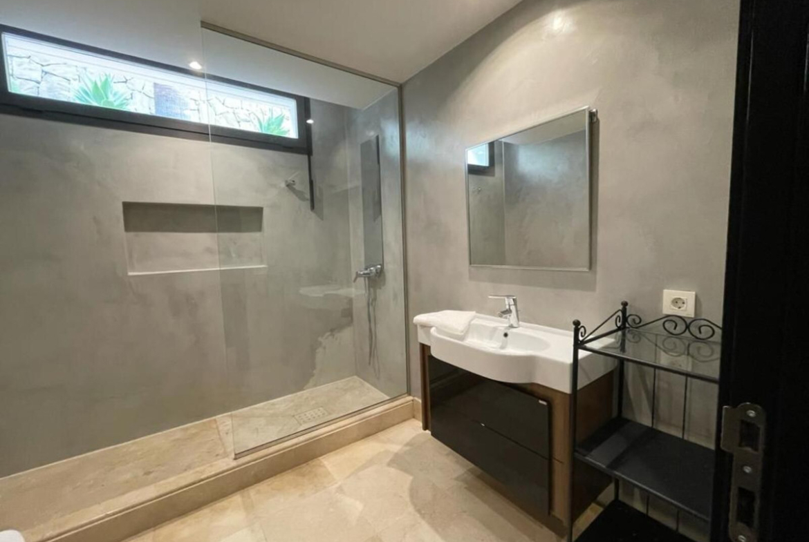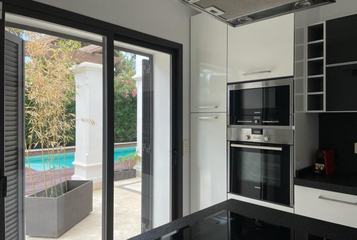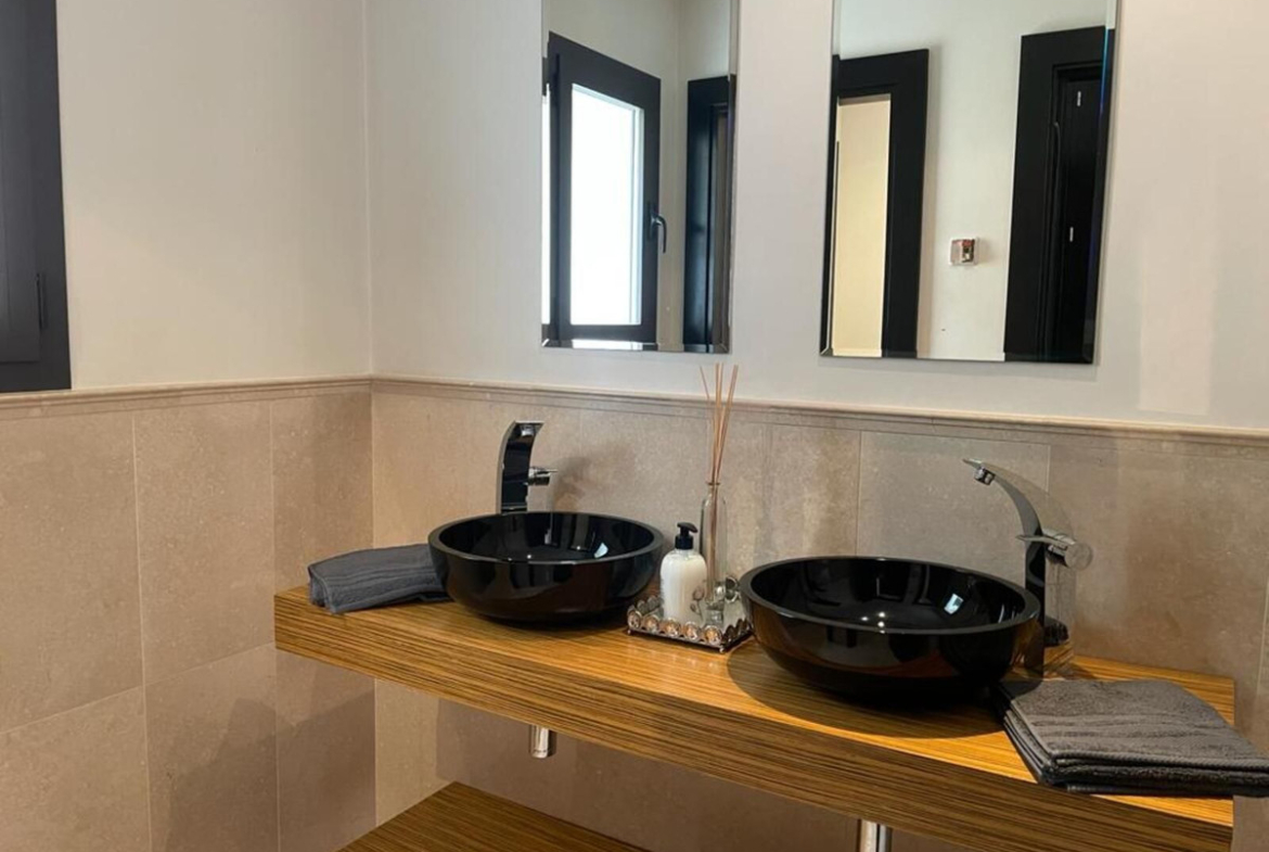 Upon entering the villa, you will find a large modern equipped kitchen, and a large living-dining room with two environments, which leads to an impressive terrace, the pool and the garden. On this same level, we also find a bedroom and a bathroom.