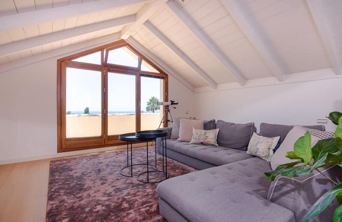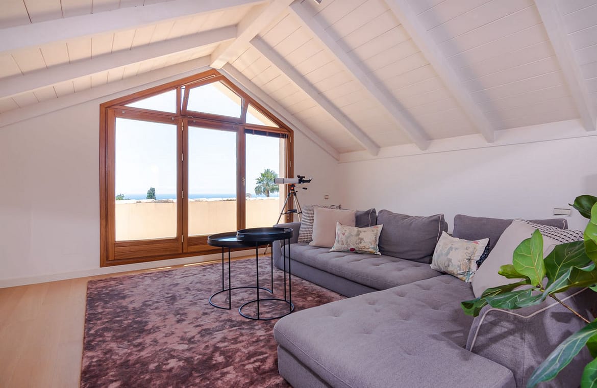 AVAILABLE LONG TERM from SEPTEMBER 2026. Elegant family villa built with a real eye for design and attention to detail in Balcones de Sierra Blanca, an exclusive residential area situated just above Marbella town and a short drive to the beach and the town centre. This southeast-facing villa is distributed on four levels and comprises, on the entrance level: hall with a guest toilet; spacious living room with fireplace and connected to the formal dining room; cosy kitchen with breakfast corner; access to the mature garden with saltwater swimming pool; en-suite guest bedroom. Upstairs: library corner; large master suite; 2 bedrooms sharing a bathroom. The 60 m2 attic could be easily converted into a further bedroom (prepared to add a bath) and currently is used as a home office and a games room. Basement: garage; storage area; staff accommodation with en-suite bedroom; toilet; laundry room. Built to the highest standards and including the following features: hot and cold air conditioning throughout, underfloor heating, Iroko teak windows with Climalit double glazing, marble floors on the entire lower level, wooden floors on the upper level of the house and water tank of 5,000 litres.
