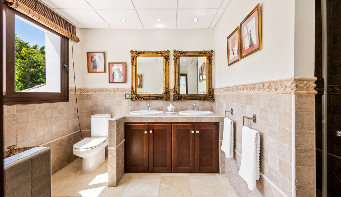 The villa is built over 2 floors with a spacious driveway and double garage. There are in total 5 bedrooms & 6 bathrooms and the property boasts a lovely mature garden and pool area.