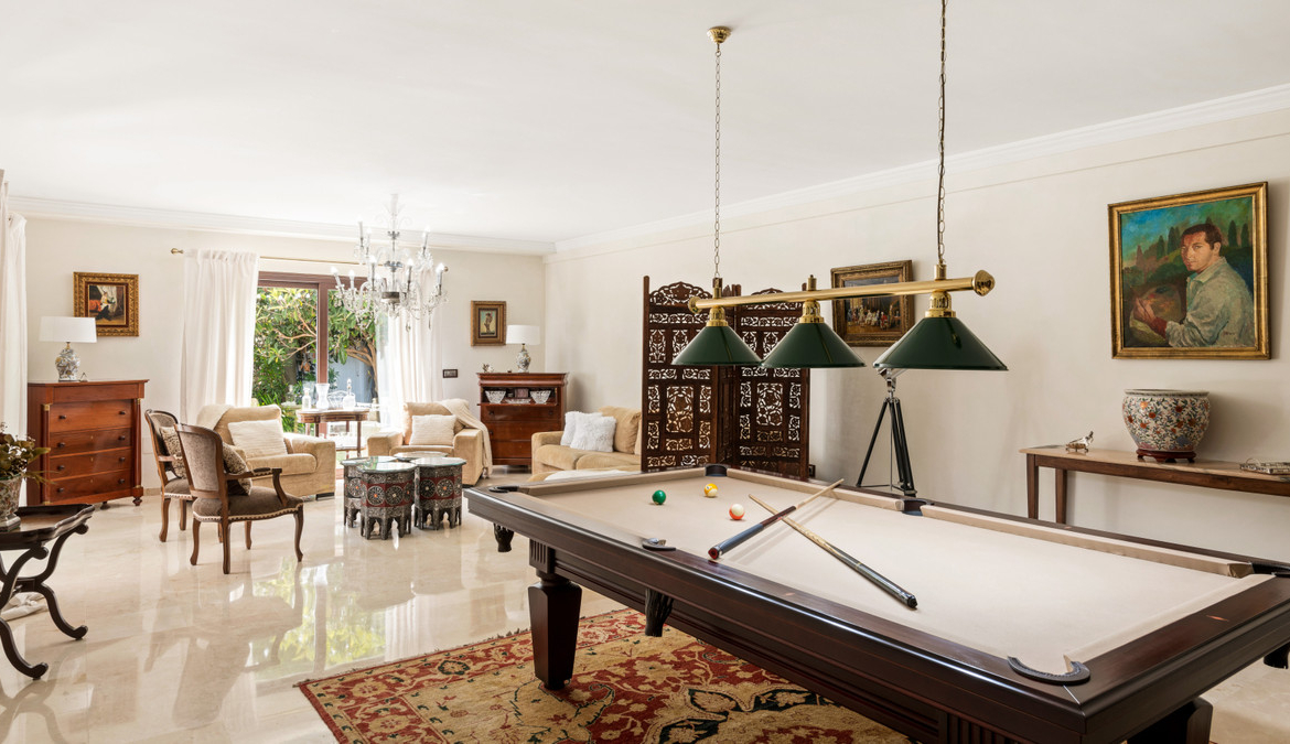 Further from the entrance hall we have a guest WC, a gym area and a 2nd lounge area with access to the cozy covered terrace with view over garden and pool area.