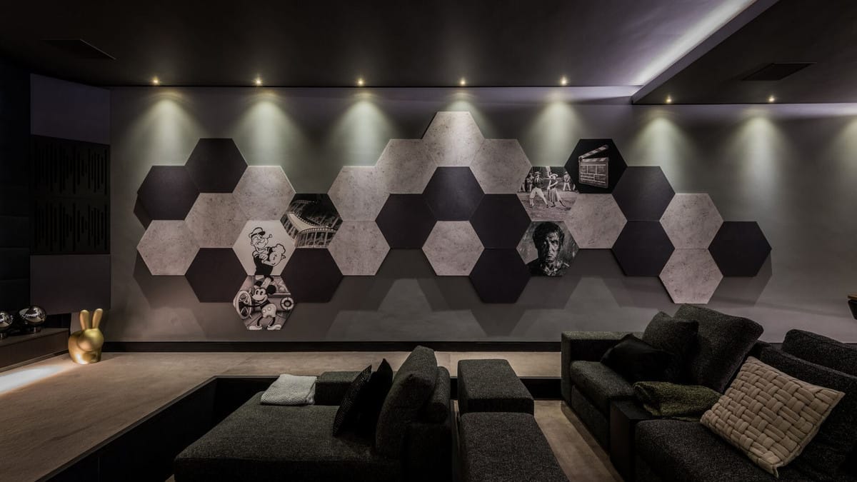 From the main vestibule, we descend one level where there are 4 large bedrooms with en suite bathrooms and all with direct access to the luscious gardens and swimming pool beyond. On this level, there is also a full gymnasium and Sauna, bodega and in house cinema, with hospitality kitchen by Siematic, and games area. The closed garage comfortably accommodates 4 cars and there is also a separate laundry room. The adjacent landscaped gardens are carefully manicured and surround the infinity pool with outdoor kitchen and BBQ by Siematic with seated area. For cooler evenings guests can also enjoy a second fire pit area in the garden.