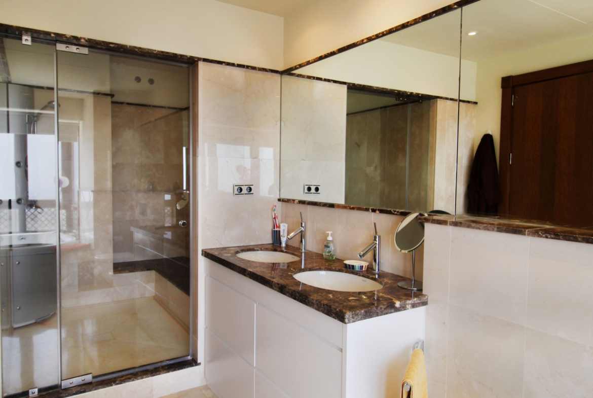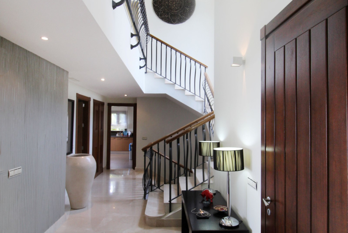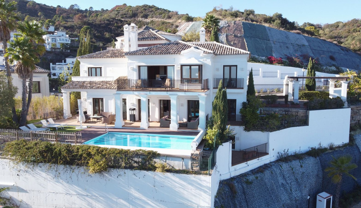 Situated on a gated community just a short walk from the beautiful village of Benahavis and all its famous restaurants, and just seven kilometres inland from the glamourous coastal hotspots of Puerto Banus and Marbella lies this contemporary south facing villa with absolutely stunning views out over the Mediterranean. This is a very spacious property with five large en-suite bedrooms distributed over three floors. The living & dining areas are open plan with lots of windows giving it a bright and airy feel throughout the day. Off the living room is a covered terrace which looks out to the heated pool and gardens, both maintained by the community and enjoy those amazing views out over the Mediterranean and La Concha mountain. The dining area is separated by the central fireplace and leads through to the large modern kitchen and breakfast area. The enormous lower level is currently used as a games room with bar, cinema and gym and enjoys natural light and views over the mountains. The standard of finish is high with underfloor heating in the bathrooms and good quality doors, windows and marble floors. The villa has private parking for two cars and plenty of storage rooms. The development is gated and has 24h security guards. This villa would make a fantastic low maintenance permanent residence or a perfect lock up and leave holiday home, which also has fantastic rental potential.