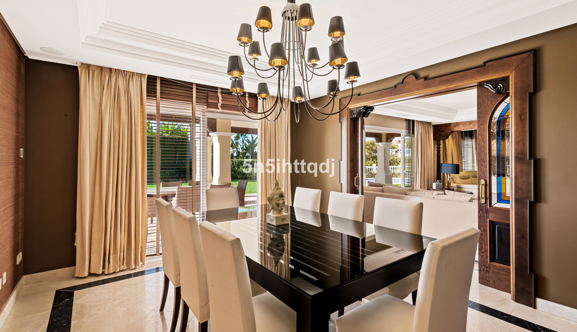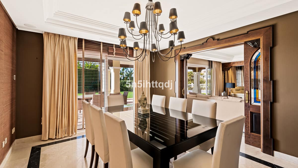 This classic-style, five-bedroom villa features a spacious entrance hall leading to an open-plan kitchen with a central island. The kitchen opens directly to the garden, extending the living space outdoors. Adjacent to the kitchen is the dining room and the main lounge, which includes a working fireplace. The ground floor also includes a guest bedroom suite and a convenient cloakroom.