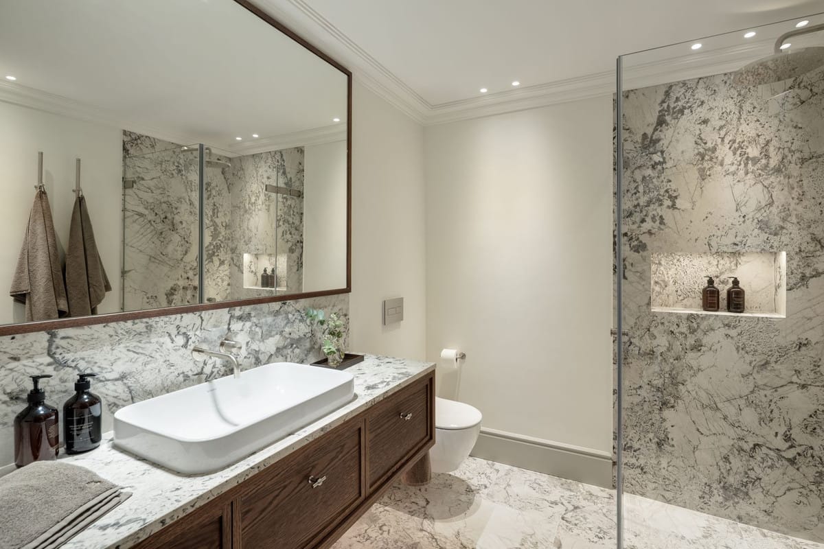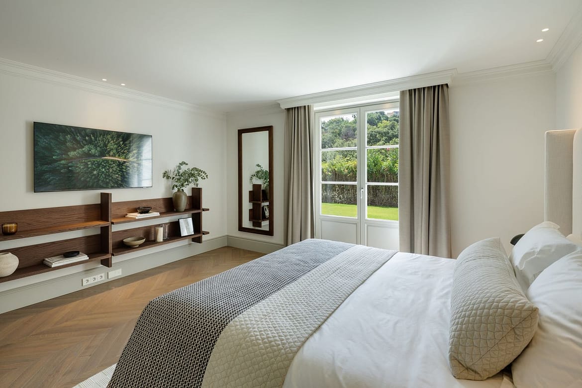 The lower level is dedicated to leisure and functionality, offering a private cinema, gym, massage room, wine cellar, service quarters, and two additional en-suite bedrooms with kitchenette. Technical areas are discreetly separated, enhancing efficiency and ease of maintenance. Integrated Zennio smart home technology provides intuitive control throughout.