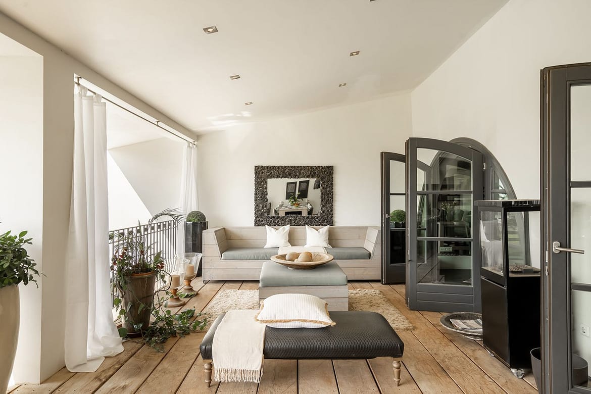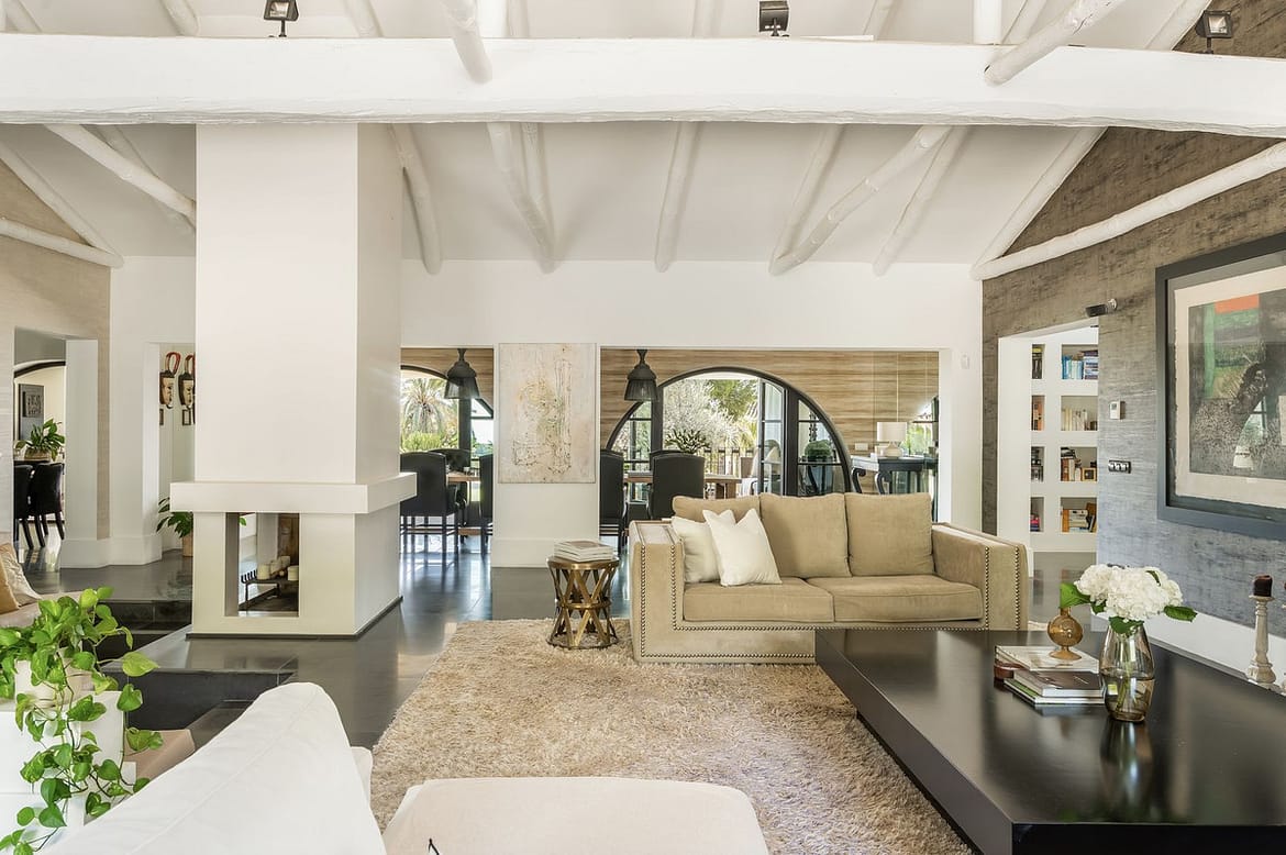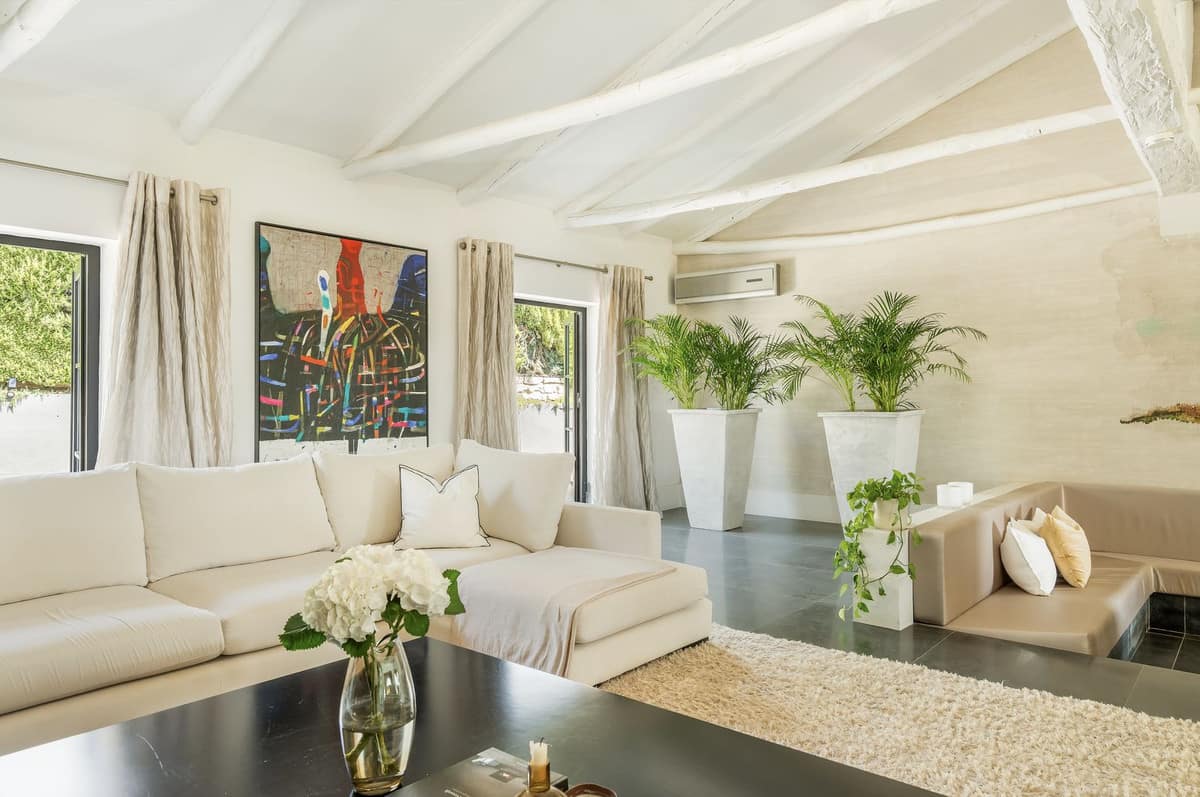The property that was renovated in 2006, features a bright open-plan kitchen with two central islands, utility room, and direct access to terraces and garden. Spacious living and dining areas are enhanced by two fireplaces, including a striking double-sided feature, and open onto a main terrace through the premium Roman Clavero carpentry windows and doors, perfect for indoor-outdoor living. The high vaulted ceiling with wood beams makes that homely feeling.