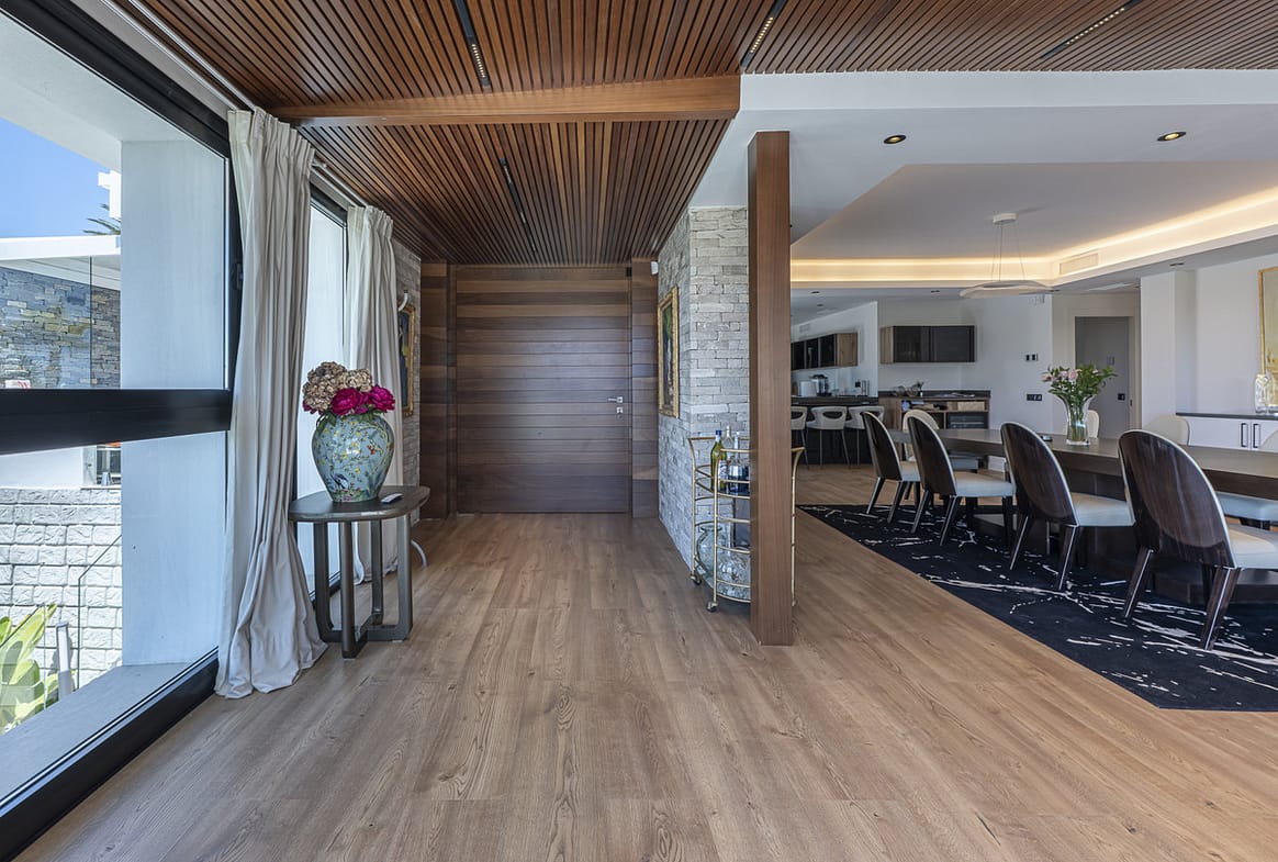 The residence features underfloor heating and electricity from advanced photovoltaic systems. Calacatta Venato marble adorns the exterior, and oak doors with an Iroko finish add elegance. The open-plan living and dining area seamlessly connects to a kitchen with wooden floors, creating an expansive space. The upper floor showcases three bathrooms with marble flooring and three bedrooms, two en suite, with illuminable wardrobes. The smaller bedroom is repurposed as a fitness area, while the main bedroom boasts a terrace with fitness equipment. The Gaggenau-equipped kitchen features top-of-the-line appliances and fine Moblapa wood furniture.