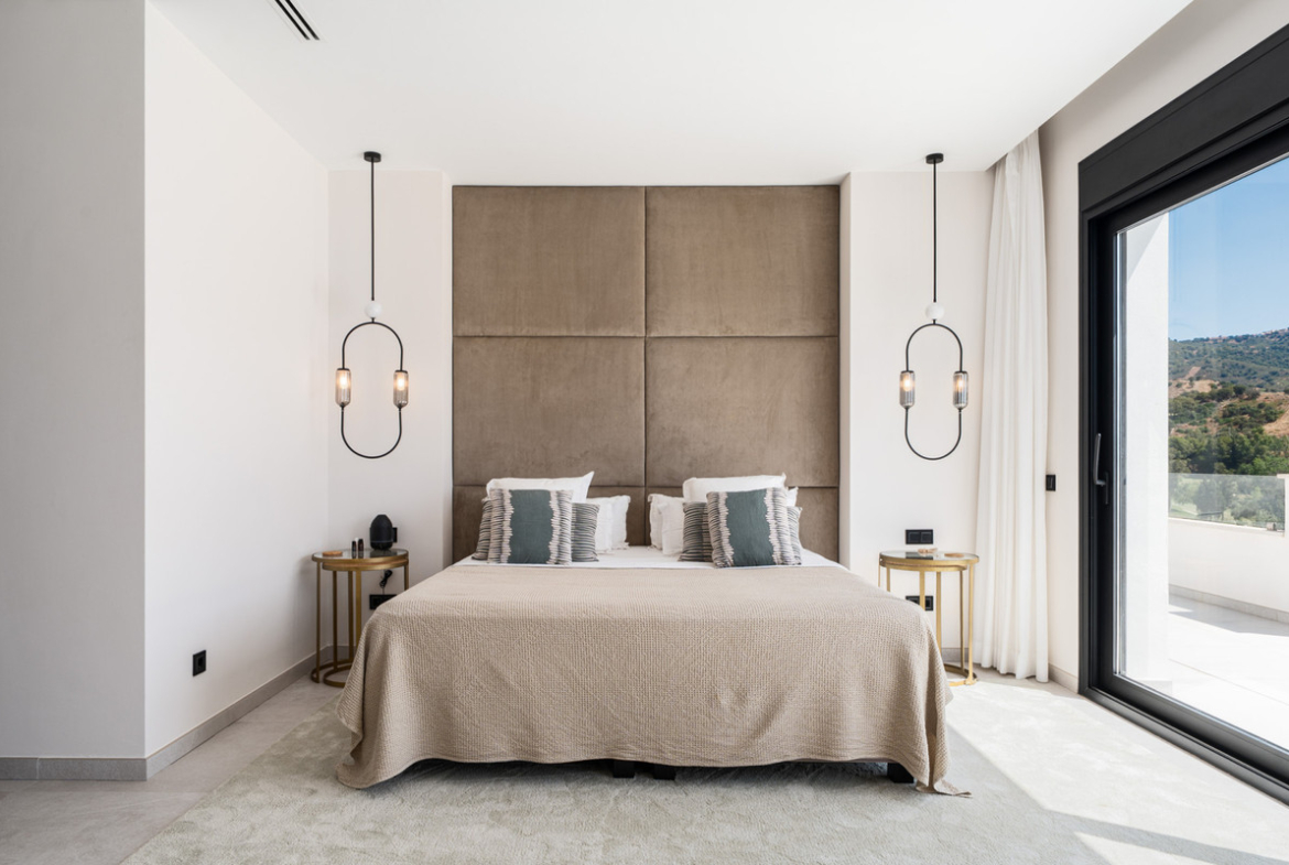 Each floor flows effortlessly to the next, with expansive terraces accessible from all bedrooms and common areas. Outdoor spaces include a covered swimming pool, private barbecue zone, and a sauna—ideal for entertaining, family life, or quiet relaxation. Panoramic views over the Santa Maria Golf course and out to the Mediterranean Sea reinforce the villa's prime positioning and tranquil atmosphere.