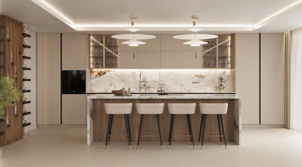 Carport for two cars, open parking for two more cars on the plot, underfloor heating throughout, premium quality finishes, and an infinity swimming pool.