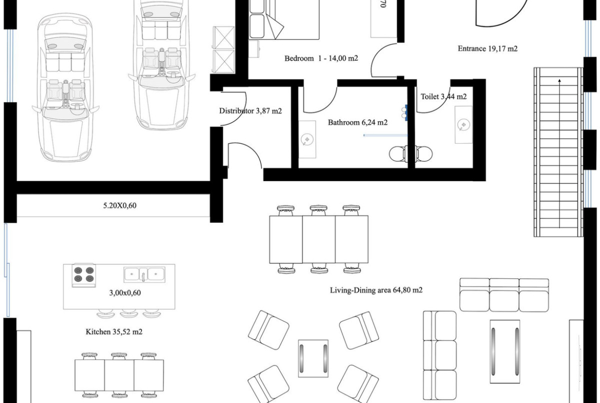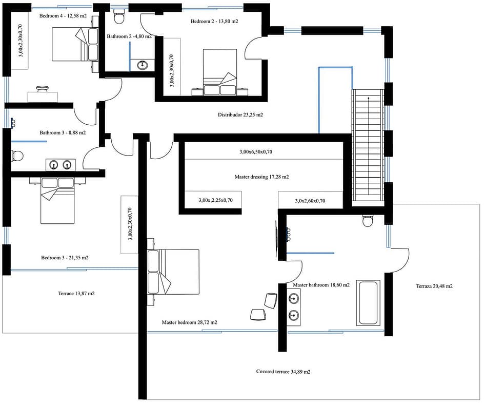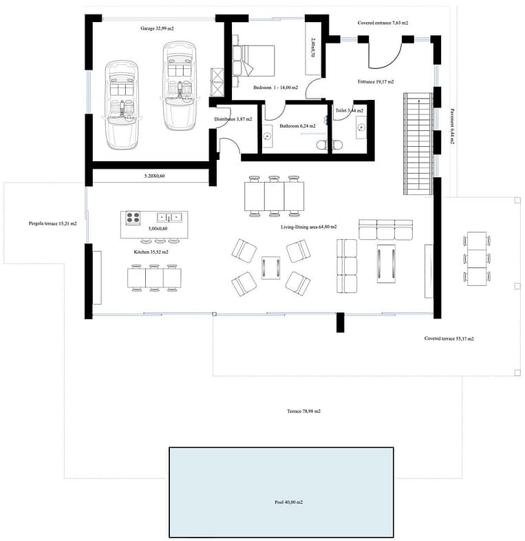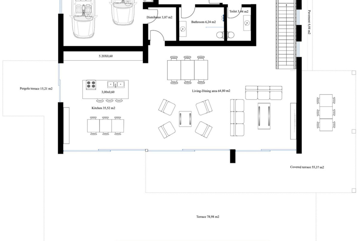 Consisting out of; ground floor, entrance hall, guest toilet, open plan living/dining area with a fully fitted kitchen, master bedroom with ensuite bathroom and dressing, covered carport for 3 car, 2 further bedrooms each with their ensuite bathroom.