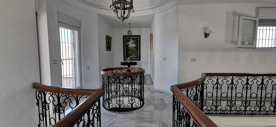 Beautiful and elegant villa in an idyllic and quiet location close to laguna beach and Estepona. Nearby you will find restaurants and supermarkets. The property has a large landscaped garden with pool, palm trees and carport for 4 cars as well as a parking zone for more than 10 cars. This two storey house is in a perfect condition with 5 bedrooms and 5 bathrooms. The living room with fireplace and direct access to the garden and pool area is a central point of the villa. A fabulous gallery adorns the lounge and gives this living room a 6-meter high ceiling. The fully equipped kitchen gives access to an additional dining room. In the entrance area there is also a classic office, which can easily be converted into another bedroom. From the property you have a breathtaking panoramic sea view and mountain view.