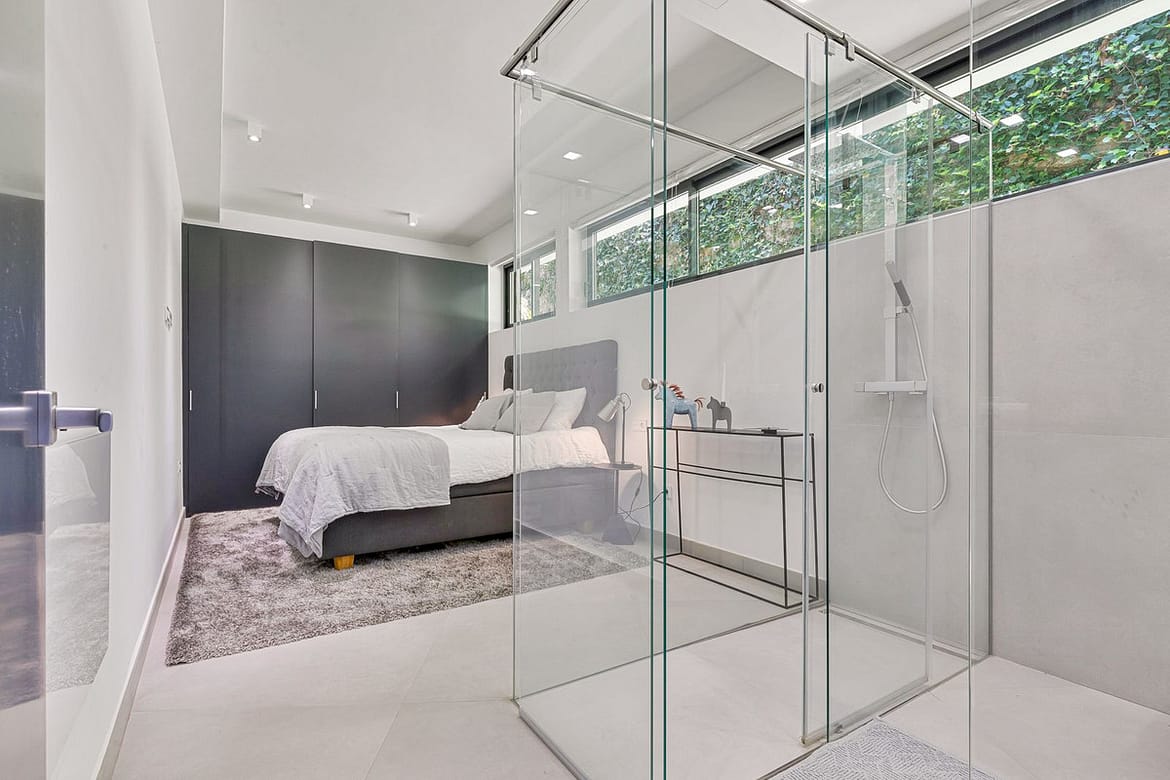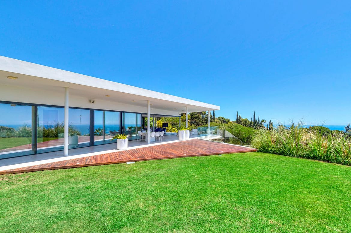 Contemporary designer villa with breathtaking views towards the sea. The villa comprises of two floors with main entrance on the upper level. From the moment you step through the front door, you are struck by the fantastic view thanks to the floor-to-ceiling glass doors along the whole front side of the house. The upper floor is characterized by an open floor plan that houses a kitchen island, integrated kitchen cabinets, dining area and sofa group. In the middle sits a glass wine cabinet. On this floor is also the master bedroom with bathroom en-suite and private dressing room. Outside the large glass doors is a lovely covered terrace that leads out to a wooden deck and lawn. From the wooden deck, a three-meter-wide staircase leads down to the 67 m2 pool with Jacuzzi. The villa's two floors are connected by the specially designed staircase, which is the jewel of the house. On the lower level there are four bedrooms, each with an en-suite bathroom with glass walls, a guest toilet, a TV-room with a small kitchen and a fireplace, a laundry room and a large double garage. Three of the four bedrooms and the TV-room have access to the wooden deck next to the pool where, in addition to space for sun loungers and a dining table, there is an outdoor kitchen, barbecue and toilet, all protected by roll-up canvas roofs. The villa is equipped with air conditioning, under floor heating, alarms, security cameras, home automation, etc. The villa is located on one of the best plots in the exclusive Reserva del Higueron urbanization on the border between Fuengirola and Benalmadena only 15 minutes from Malaga International Airport. In the area there is the 5-star Hotel Hilton, sports club with gym, spa, padel and tennis courts and a Michelin restaurant.