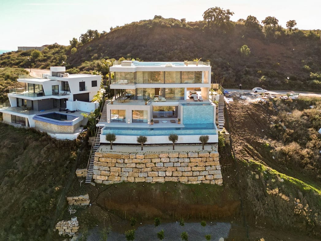 The first floor hosts a spectacular master bedroom with two walk-in wardrobes and a luxurious en-suite bathroom. There is also a second en-suite bedroom. An exterior staircase takes you up to the dream-like solarium, featuring a jacuzzi and outdoor lounge area, where you can soak up the sun all day and admire jaw-dropping views.