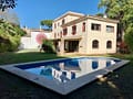 The main level welcomes you with a bright living room featuring a fireplace, a separate dining area, and direct access to covered and open terraces overlooking the garden and pool. A fully fitted Bulthaup kitchen provides ample storage and workspace, ideal for everyday living and entertaining. The villa offers five well-proportioned bedrooms, including a spacious master suite, and several bathrooms finished in a modern style.