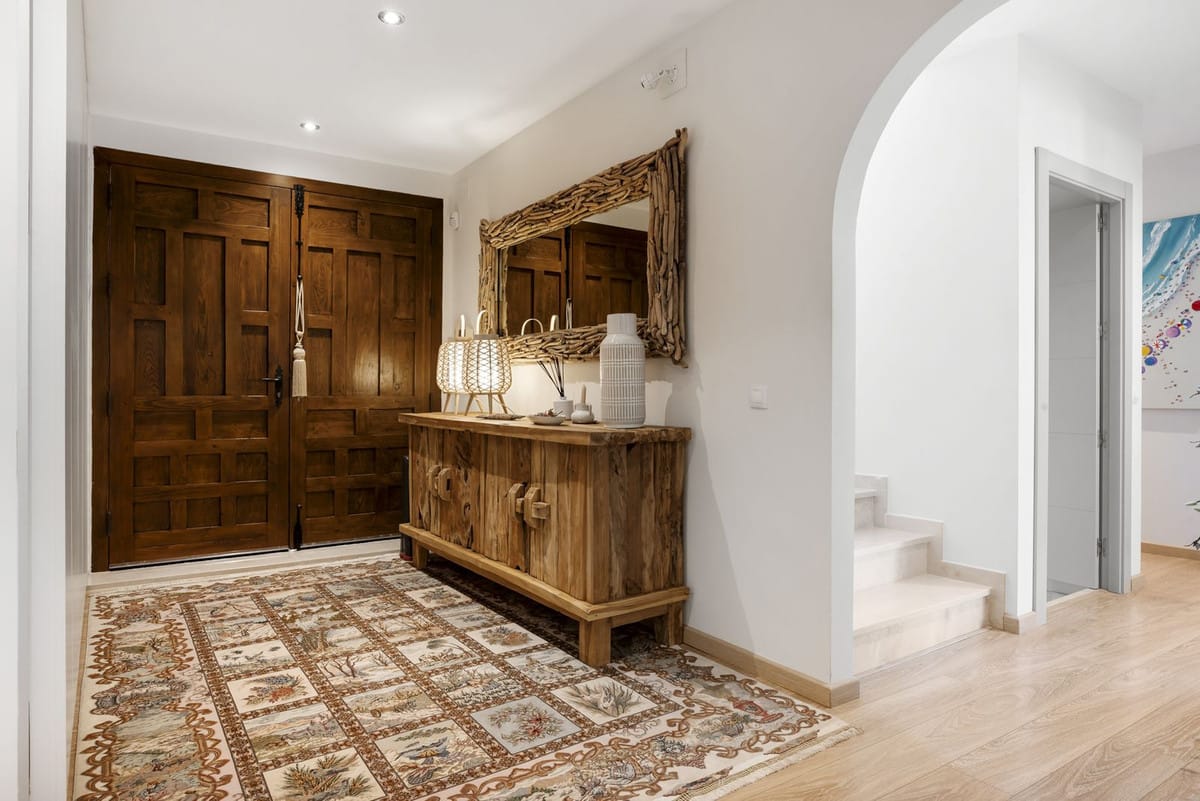 On the ground floor, the entrance hall welcomes you with elegant wooden doors and a guest toilet. The spacious 50 m² living room offers both a sitting area and dining area. A separate fully fitted kitchen with built-in NEFF appliances 2 x Fridge-freezer, Microwave, Oven, Dishwasher, Coffee machine, the kitchen opens onto a terrace.