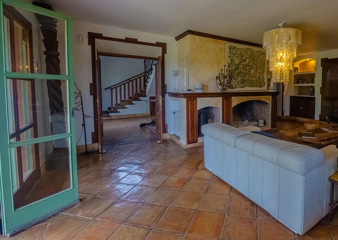 The villa is fully furnished and features a large living room with a fireplace, creating a warm and comfortable atmosphere. Large sliding doors open onto a private covered terrace with views of the mountains and landscaped garden, offering a perfect space for relaxing or dining outdoors.