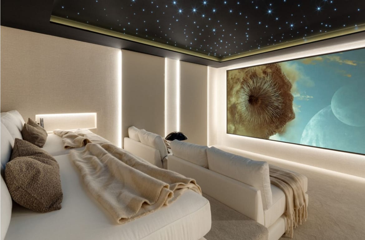 Upon arrival, the villa captivates with its immaculate white façade, lush landscaped gardens, and a stately driveway that sets the tone for what lies within. The interiors impress with spacious open-plan living areas, high ceilings, and an abundance of natural light, all enhanced by a refined neutral palette and elegant finishes. The home features multiple living lounges, a bespoke designer kitchen, a state-of-the-art home cinema, a climate-controlled wine bodega, and a fully equipped gym and spa—offering the ultimate in luxury and lifestyle.