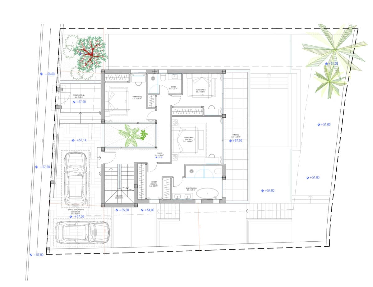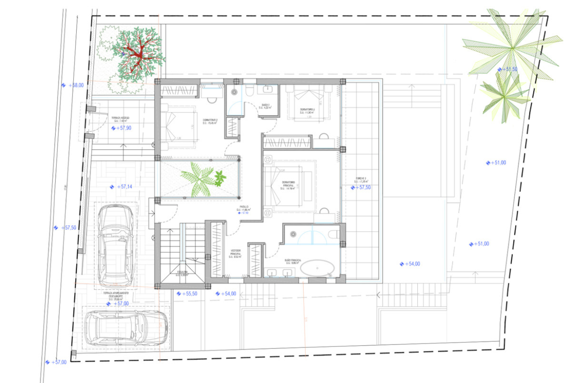 The first floor offers two bedrooms sharing a bathroom, plus the master bedroom with ensuite and walk-in wardrobe. Both the master and one bedroom open onto a covered terrace. This level also has an extra entrance and a parking space.