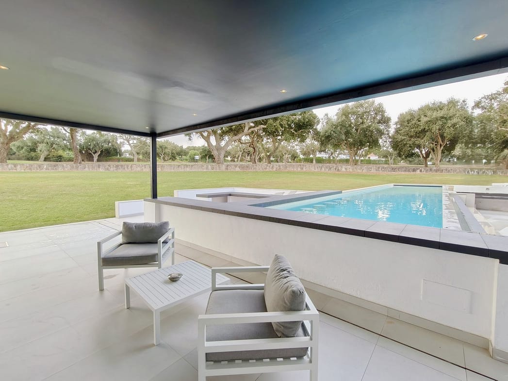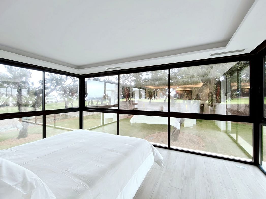 The property offers multiple terraces that capture panoramic golf views, a beautifully landscaped garden with a heated private pool, and a stylish pergola providing parking for two cars. Inside, the spacious master suite features a private lounge area, an elegant bathroom with both bath and walk-in shower, and a dressing room. Expansive floor-to-ceiling windows flood the interiors with natural light, creating a seamless connection between indoor and outdoor living spaces.