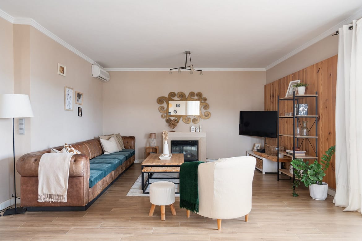 The house is thoughtfully arranged over two levels, with the upper floor forming the social and representative heart of the home. The main entrance opens into a welcoming hallway with a guest WC. From here, you step into a bright and inviting living room, where a fireplace adds warmth and character, and glass doors open seamlessly onto one of the terraces, overlooking the surrounding residential area. At the centre of this floor lies a spacious kitchen with an adjoining dining area, perfectly suited for both everyday family life and larger social gatherings. Through double doors, the kitchen connects to a second living room located at the opposite end of the house, offering direct access to the outdoor areas and swimming pool. A second fireplace enhances the cosy ambiance of this space.
