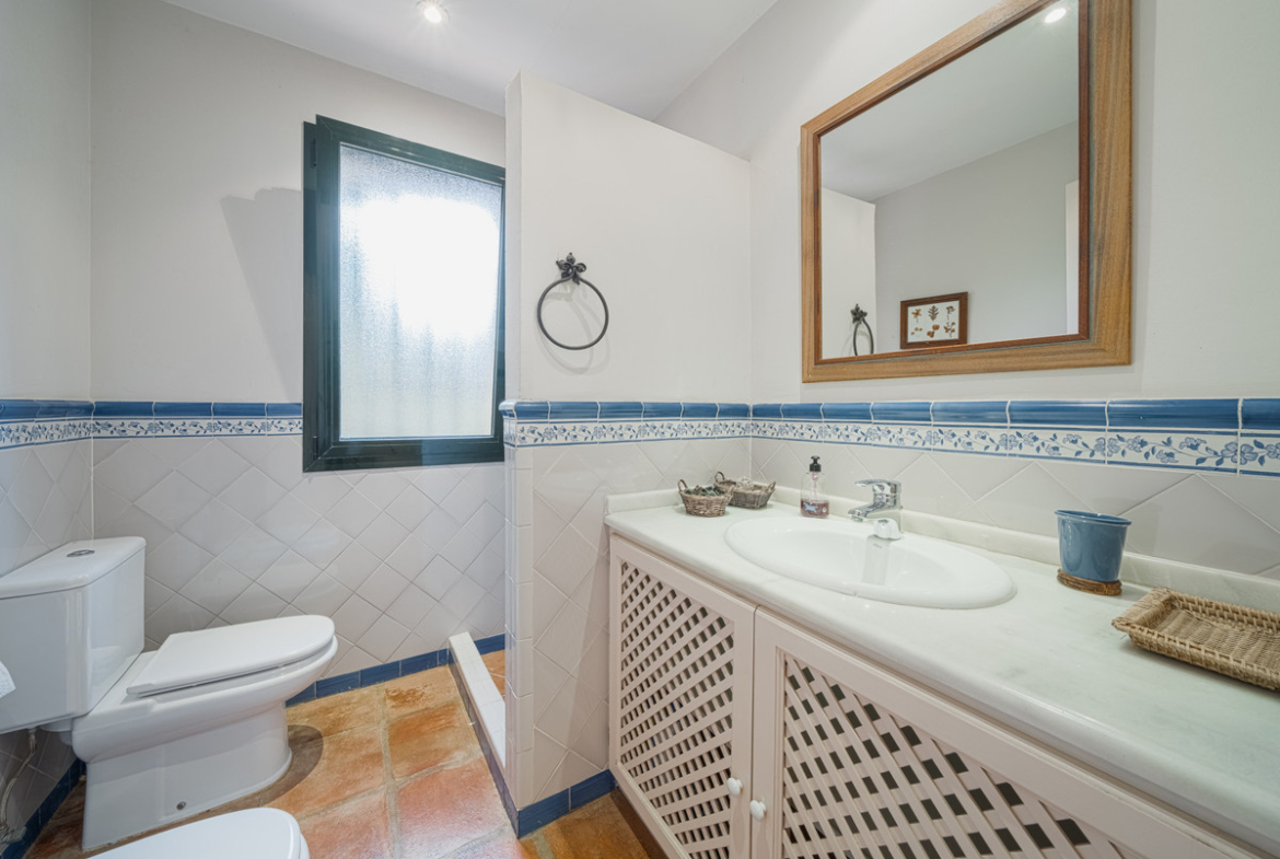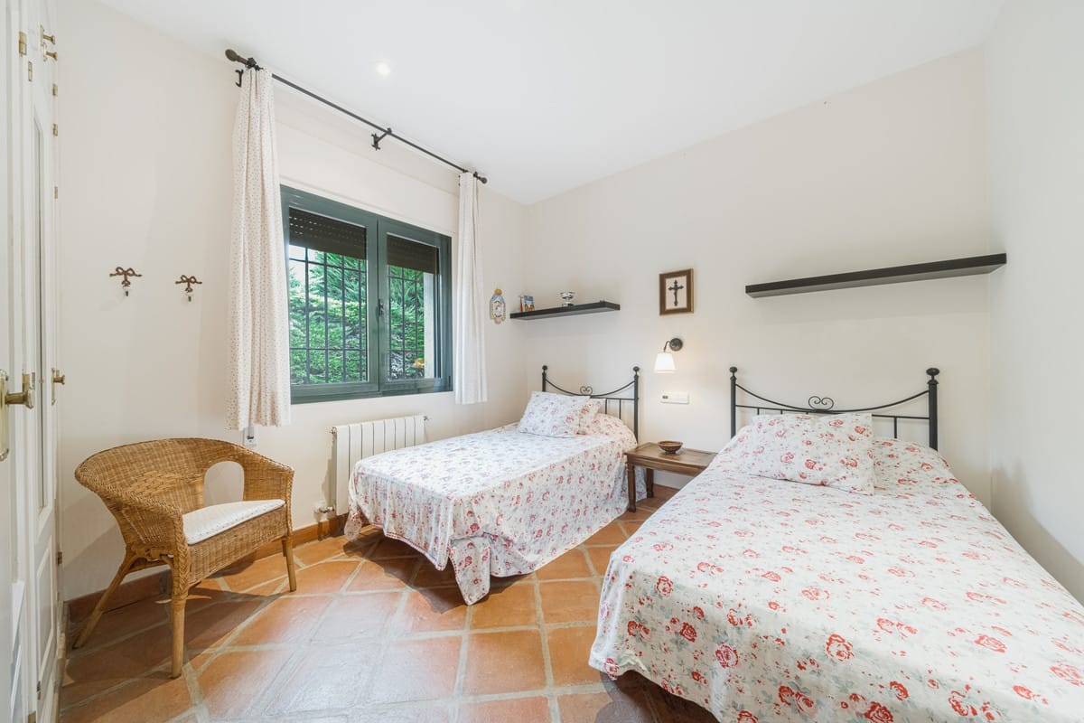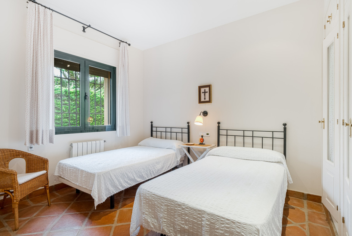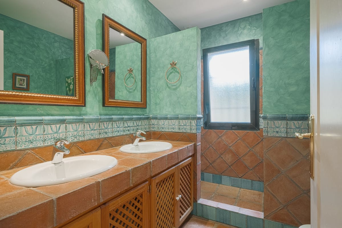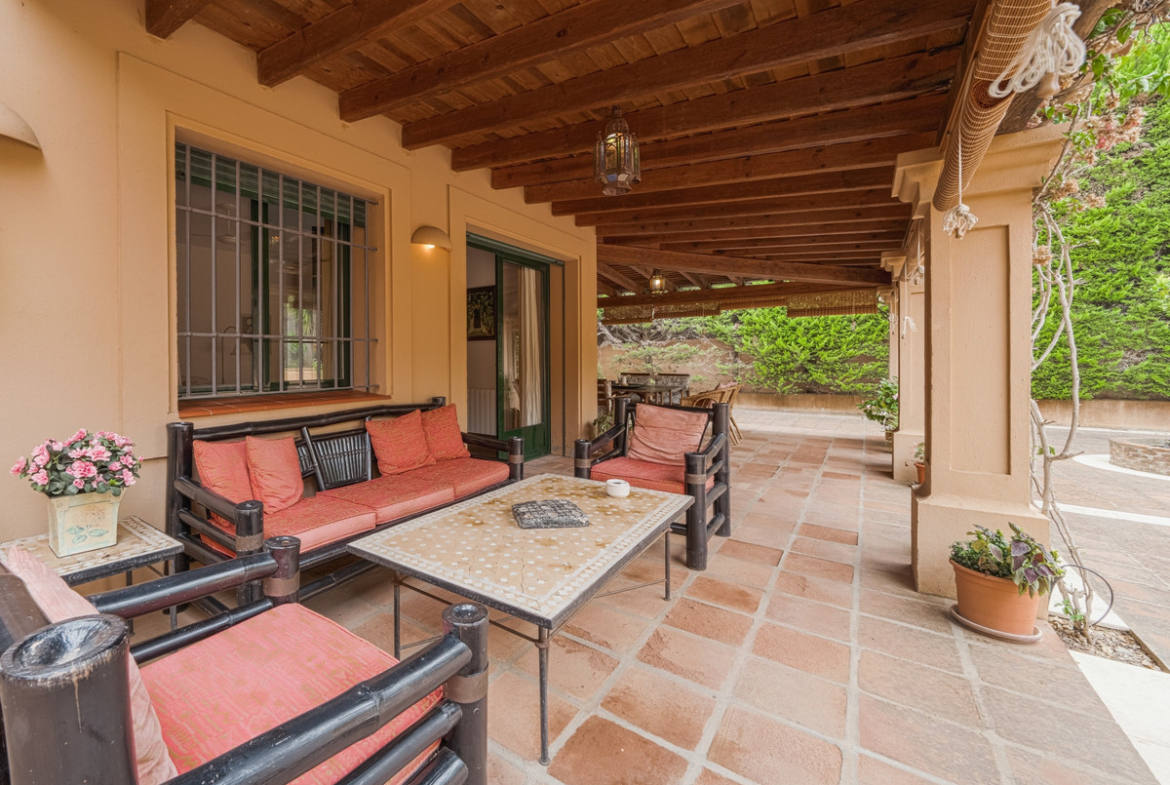 The property is accessed through a private driveway with parking space for several cars. Distributed mainly on one level, this southwest-facing villa comprises: spacious living/dining room with access to a covered porch with wooden beams leading to a beautiful Andalusian patio with a fountain and ornamental trees and the private swimming pool on the other side; fully fitted and equipped kitchen with laundry area; 4 en-suite bedrooms; guest toilet. Upstairs: further bedroom/office with access to a small terrace.