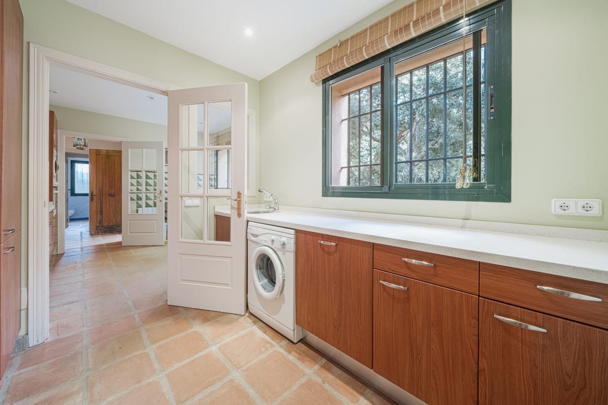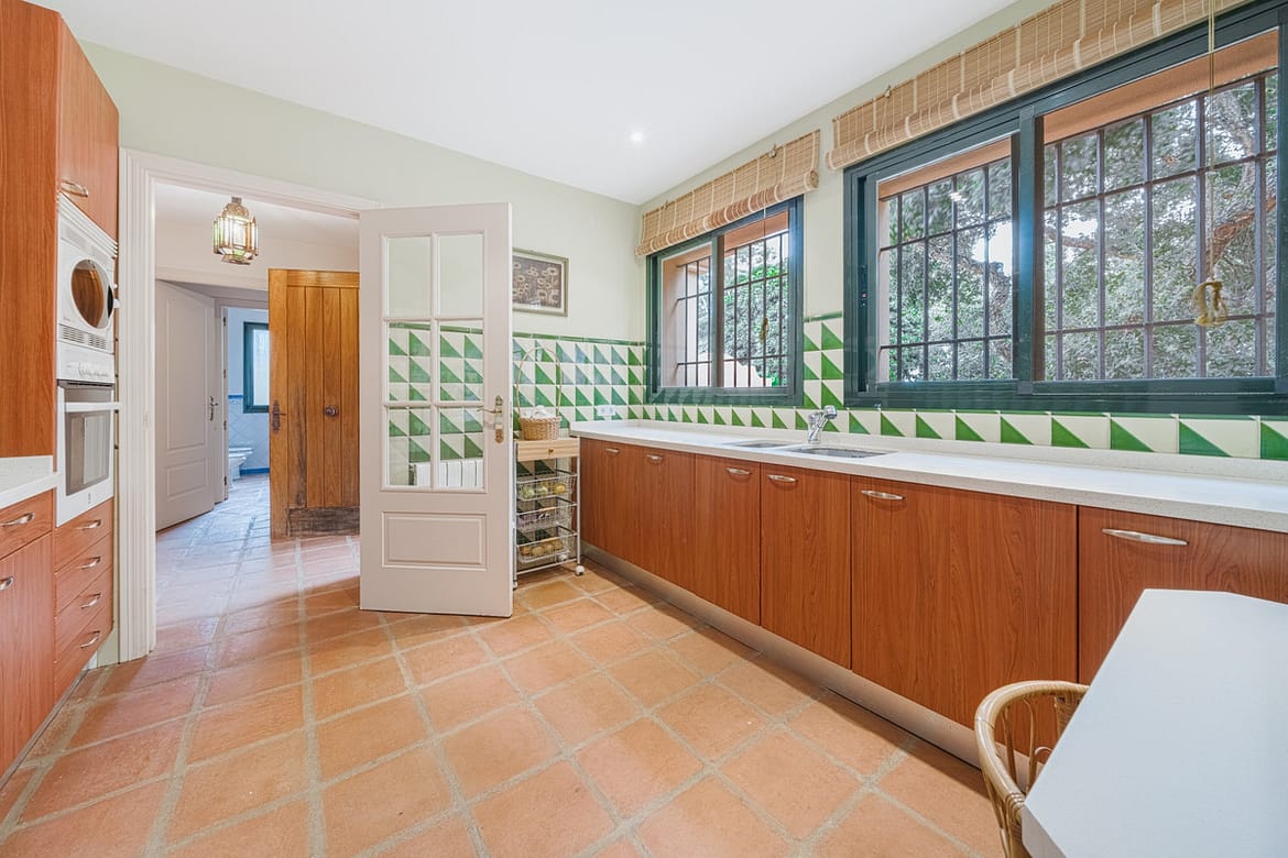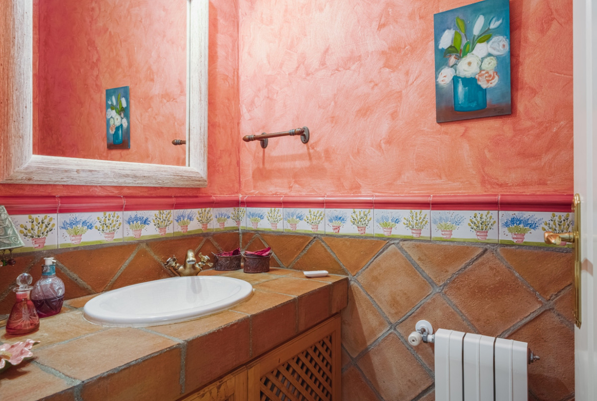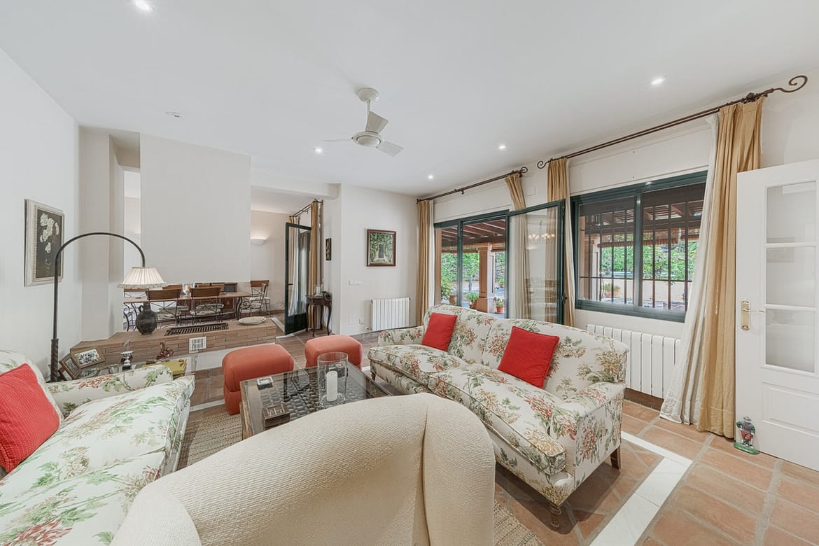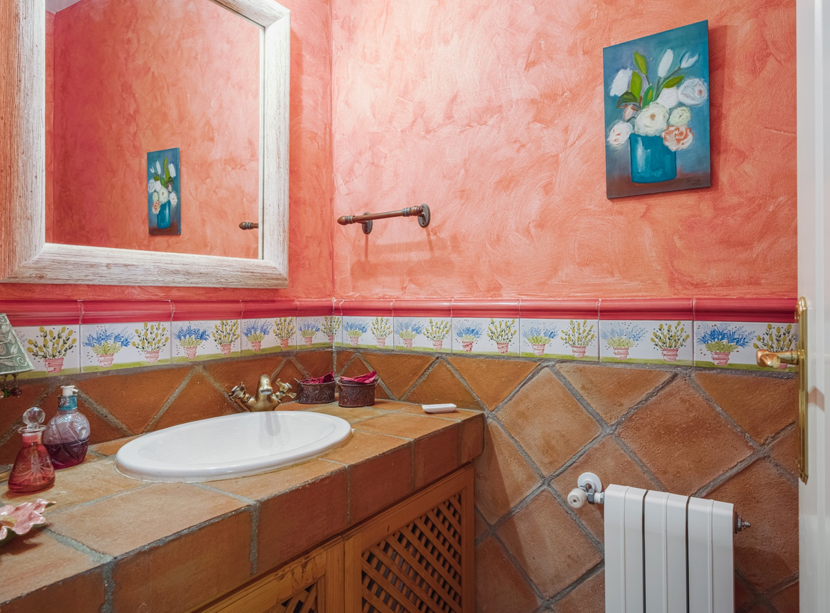 The property is accessed through a private driveway with parking space for several cars. Distributed mainly on one level, this southwest-facing villa comprises: spacious living/dining room with access to a covered porch with wooden beams leading to a beautiful Andalusian patio with a fountain and ornamental trees and the private swimming pool on the other side; fully fitted and equipped kitchen with laundry area; 4 en-suite bedrooms; guest toilet. Upstairs: further bedroom/office with access to a small terrace.