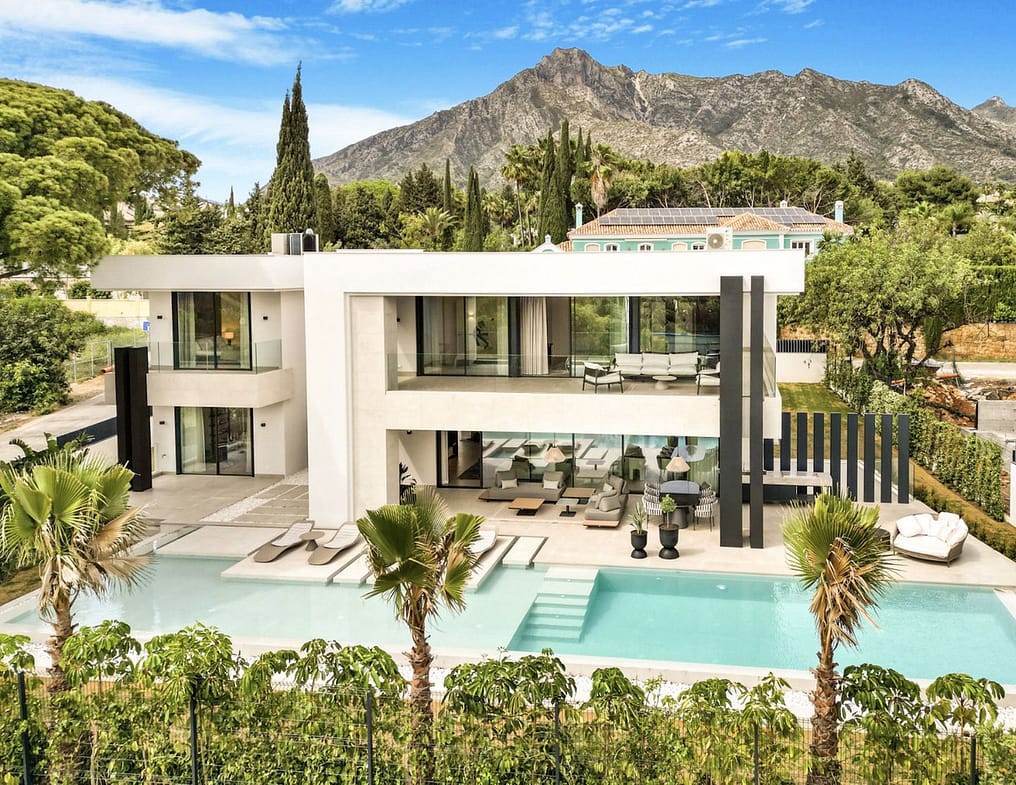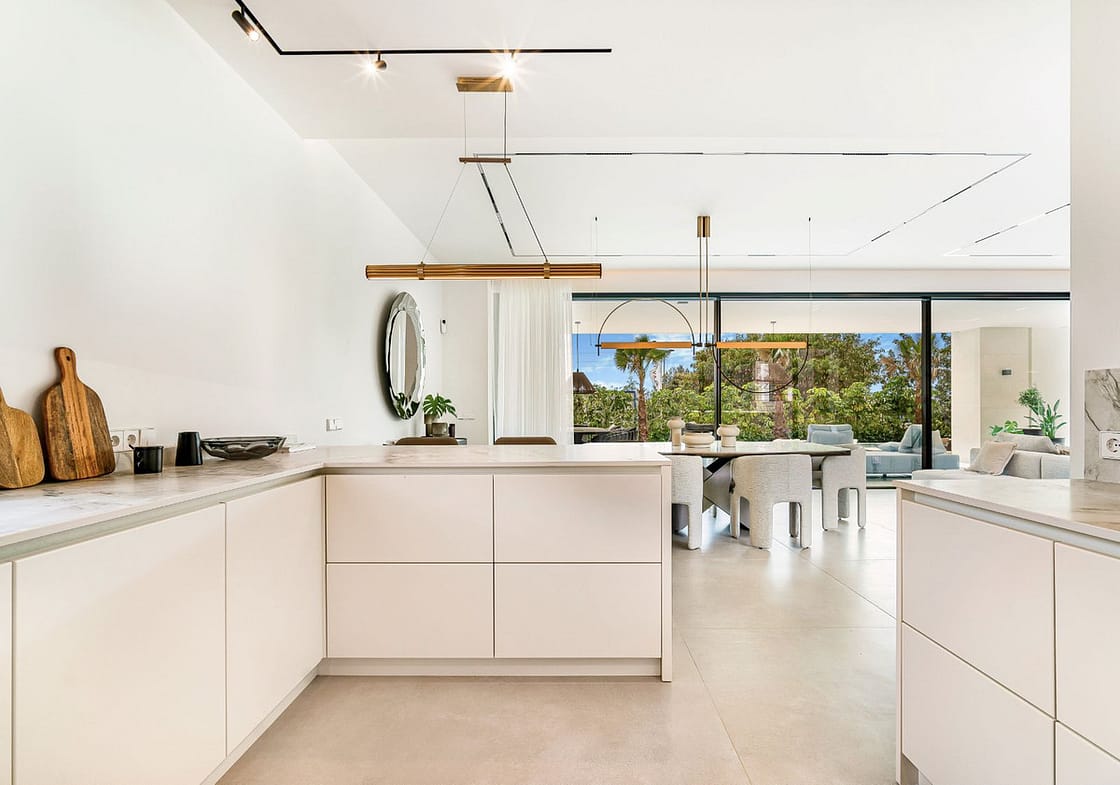 Strategically positioned on an elevated site facing south, the villa boasts spectacular views of the Mediterranean Sea and the iconic La Concha mountain, filling the interiors with natural light throughout the day.