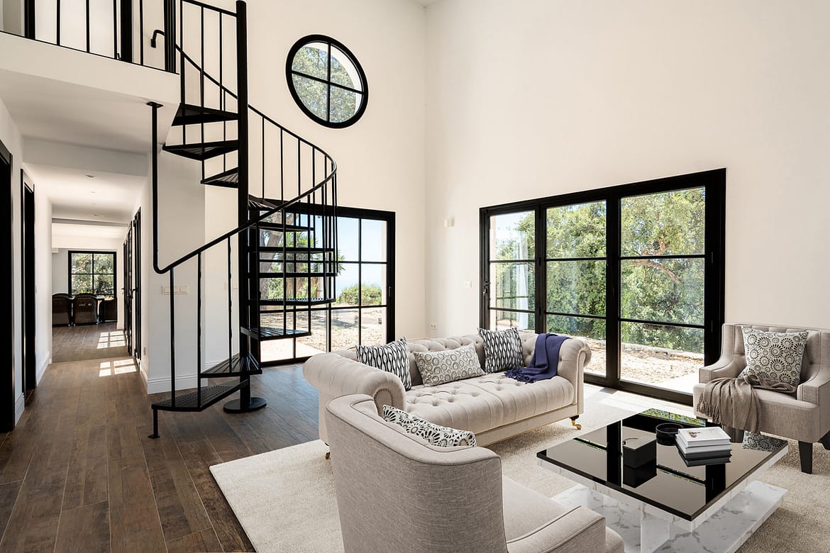 The villa spans 250m² with an additional 30m² separate guest studio, designed with bright open spaces and finished to the highest Scandinavian standards.. On the ground floor, you’ll find two bedrooms with bathrooms, while a striking spiral staircase leads to the first floor with an en-suite bedroom and a breathtaking master suite with panoramic windows.