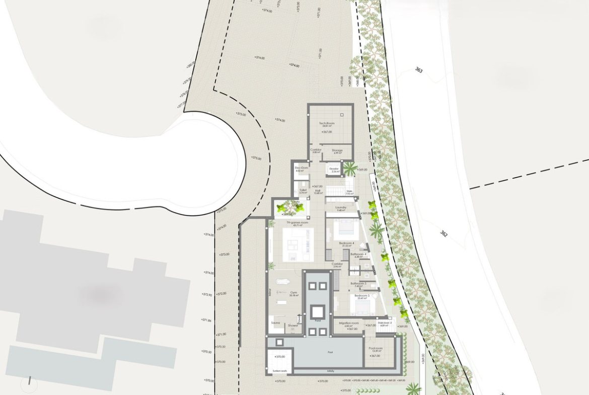 The project is designed with five spacious bedrooms and seven opulent bathrooms across three meticulously planned levels. Quality is paramount, with high-grade materials used throughout the property. This exquisite villa offers an array of high-end amenities, including a full gym, private cinema, game room, wine cellar, elevator, and sauna. Every detail has been thought of to provide you with the ultimate luxury living experience.