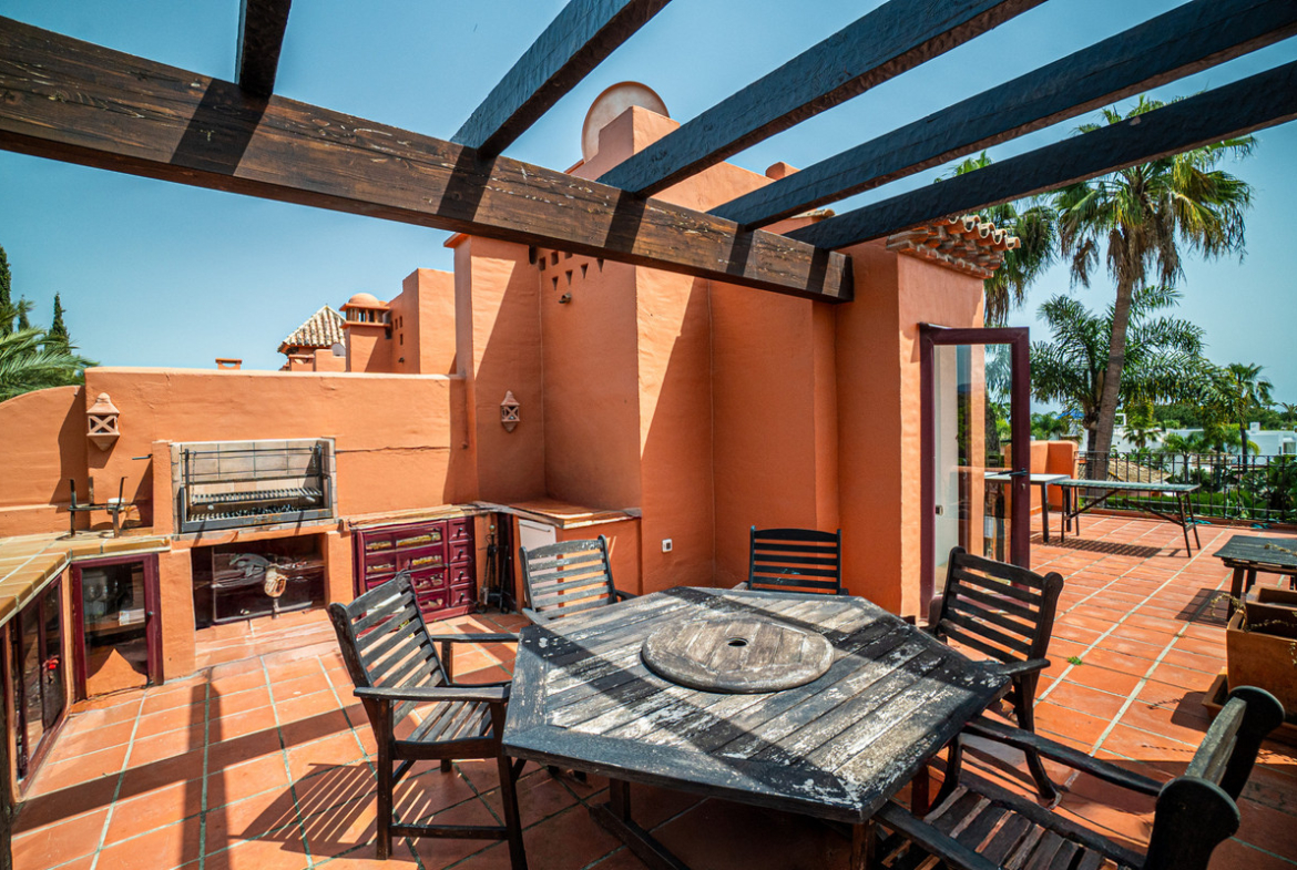 Townhouse Oasis is a five-bedroom luxury home in one of Marbella’s most prestigious gated communities on the Golden Mile. Surrounded by tropical gardens, this townhouse offers privacy, comfort, and Mediterranean charm. With multiple terraces, a private garden, and a rooftop solarium, it combines outdoor living with elegant interior spaces, making it ideal for families or buyers looking for a secure retreat close to the beach and amenities.