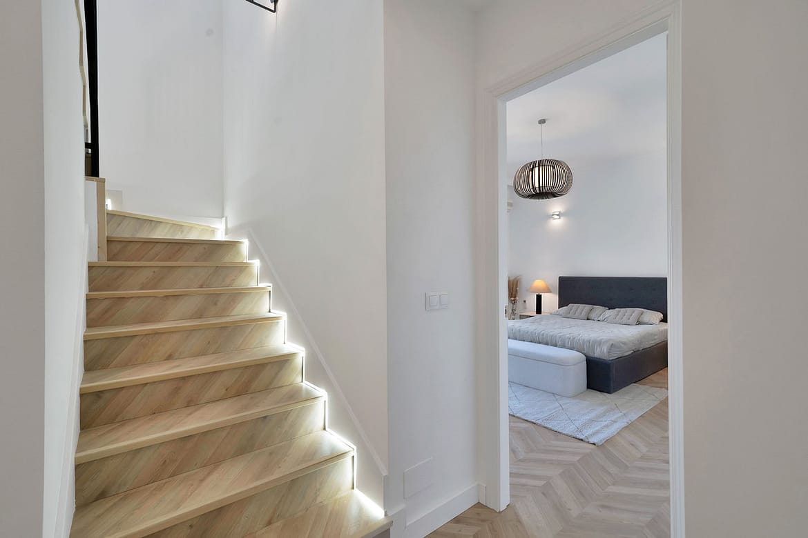 The house is distributed across two levels. On the main floor, a brand new open plan kitchen with top of the range appliances connects seamlessly to the living area with a travertine marble fireplace and dining space. Large glass doors open onto a sunny terrace with a barbecue area and a private plunge pool, ideal for outdoor entertaining. This level also offers a spacious en suite bedroom and a guest powder room.