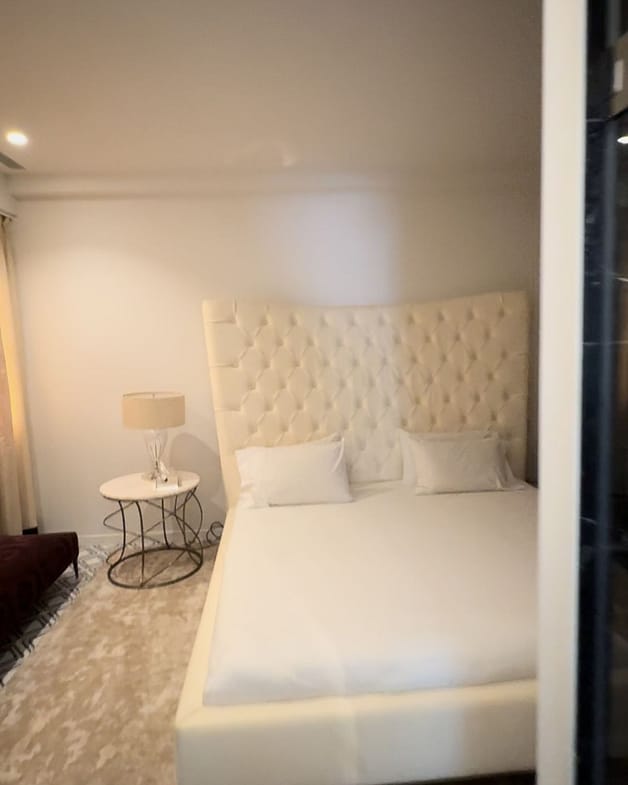 To the left of the elevator, you enter the second bedroom (BR2), designed in a unique layout featuring an elegant king-size bed, a separate shower and toilet, and an adjacent sink area, all adorned with beautiful silk curtains.