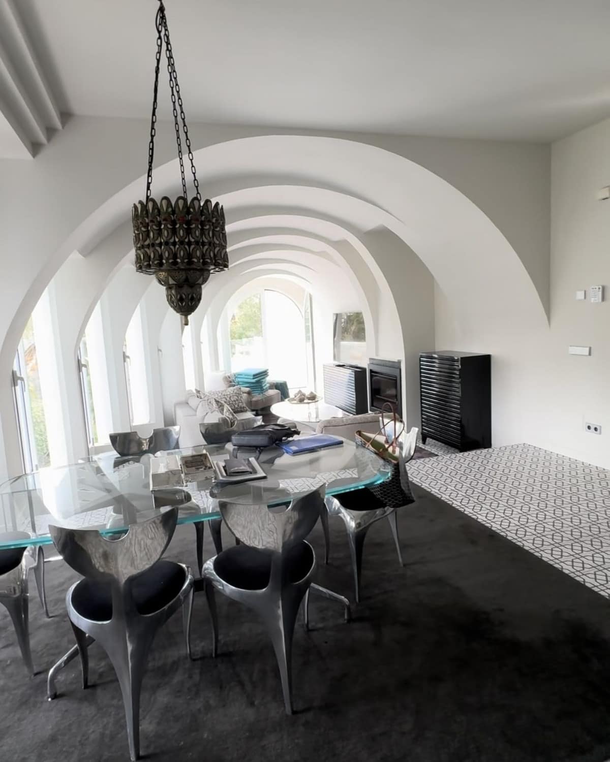 Spread over 4 levels, all connected via a state-of-the-art glass elevator, this home offers generous spaces and an optimized layout. The open-plan concept includes an entrance hall, a living room with a vaulted ceiling and an open fireplace, an elegant dining area, and a modern, fully-equipped Gaggenau kitchen with sleek black granite countertops.