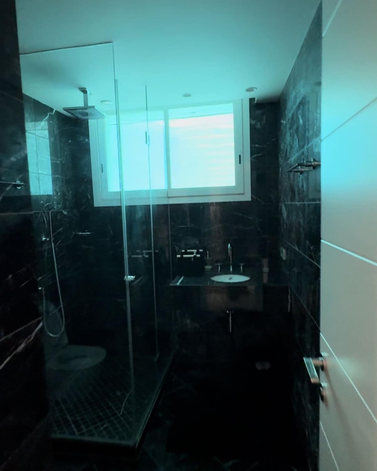 The spacious master bathroom, like all the bathrooms in the house, is adorned with luxurious black marble and includes a large double shower, a double sink, a toilet, and a bidet. There is a door from the bathroom that opens directly to the garden, providing outdoor access without needing to use the elevator. Each bathroom is filled with natural light thanks to well-placed windows.
