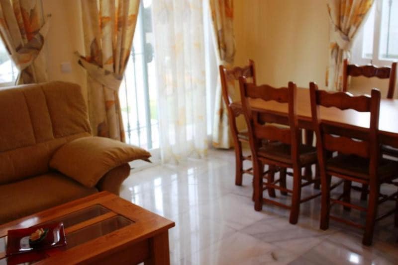 Villa for rent in Calahonda with partial sea views. The house has 2 floors. Ground floor: living room with TV, dining room. 1 room with 1 double bed, 2 bedrooms with 2 beds (90 cm) each. Living room with TV, fully equipped kitchen (dishwasher, microwave, freezer, coffee maker), bathroom. Upper floor: 1 room with 1 double bed and private bathroom and TV, 1 bedroom with 1 bed (135 cm), 1 double bedroom with 2 beds, 1 bath, terrace.