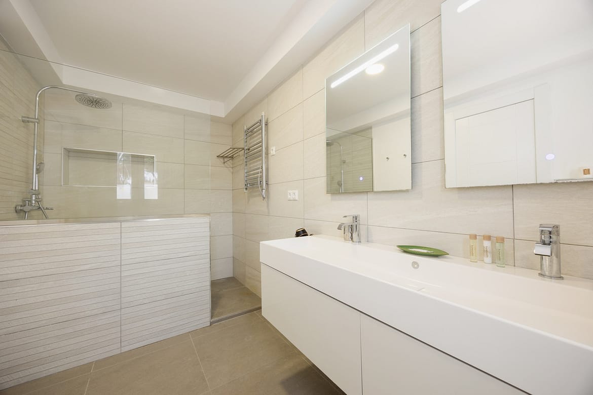 The two bathrooms on this floor are fully equipped. One features a hydromassage bathtub positioned toward a large window, allowing you to soak while enjoying magnificent sea views. It also includes a walk-in shower, towels, and a hairdryer. The second bathroom offers a comfortable shower and all necessary amenities for a pleasant stay.