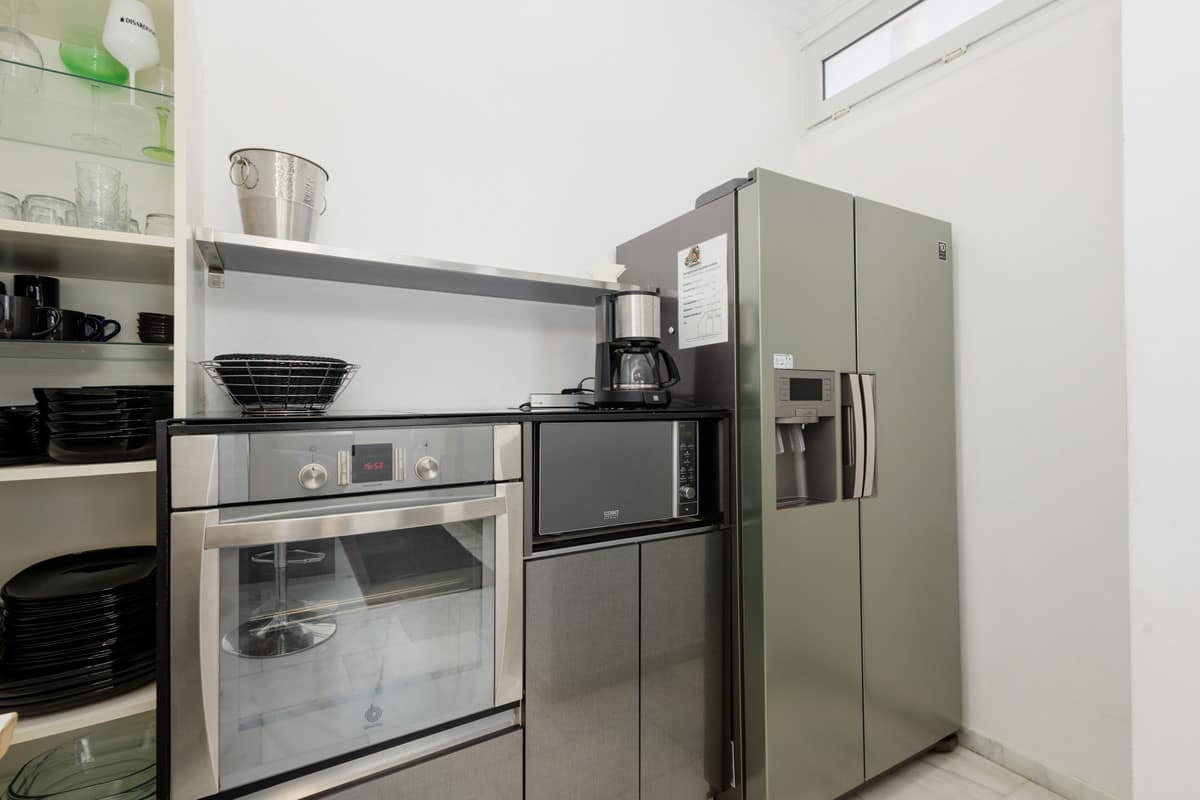 On the first floor, you'll find three en-suite bedrooms with queen beds, Smart TVs, and spacious wardrobes; two open to an interior patio with a table, and the third provides access to the main terrace. Each bathroom features a walk-in shower, towels, and a hairdryer, with one also offering a bathtub. This floor also includes a spacious living-dining room with sofas, smart TV and speaker, desk, and a fully equipped American-style kitchen with oven, microwave, dishwasher, coffee maker, toaster, refrigerator with water and ice dispenser, freezer, and recycling bin. The kitchen also includes an extra storage area for dishes, cookware, and basic utensils—all provided.