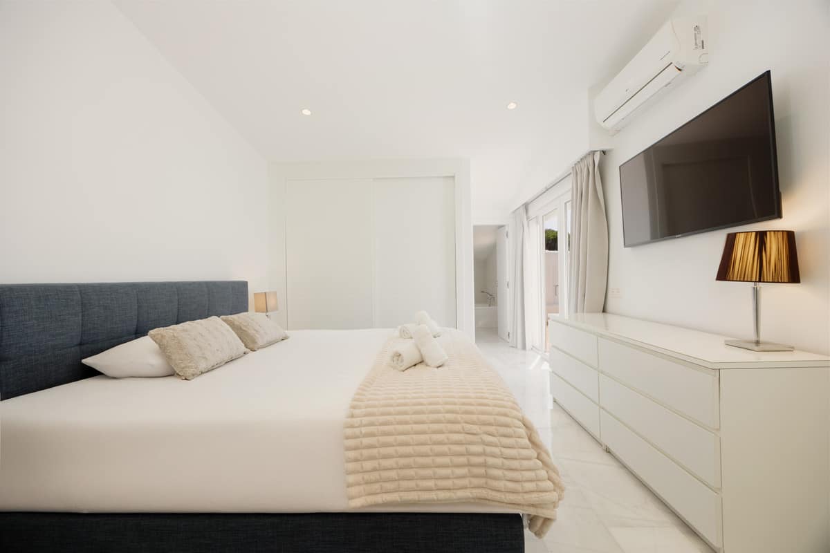 The two bedrooms on this level are thoughtfully designed for maximum comfort. One has a double bed, Smart TV, independent air conditioning, a reading sofa, ample storage space, and breathtaking views of the terrace, pool, and sea. The second bedroom, of open-plan style, also features a double bed, air conditioning, Smart TV, and views of the pool.