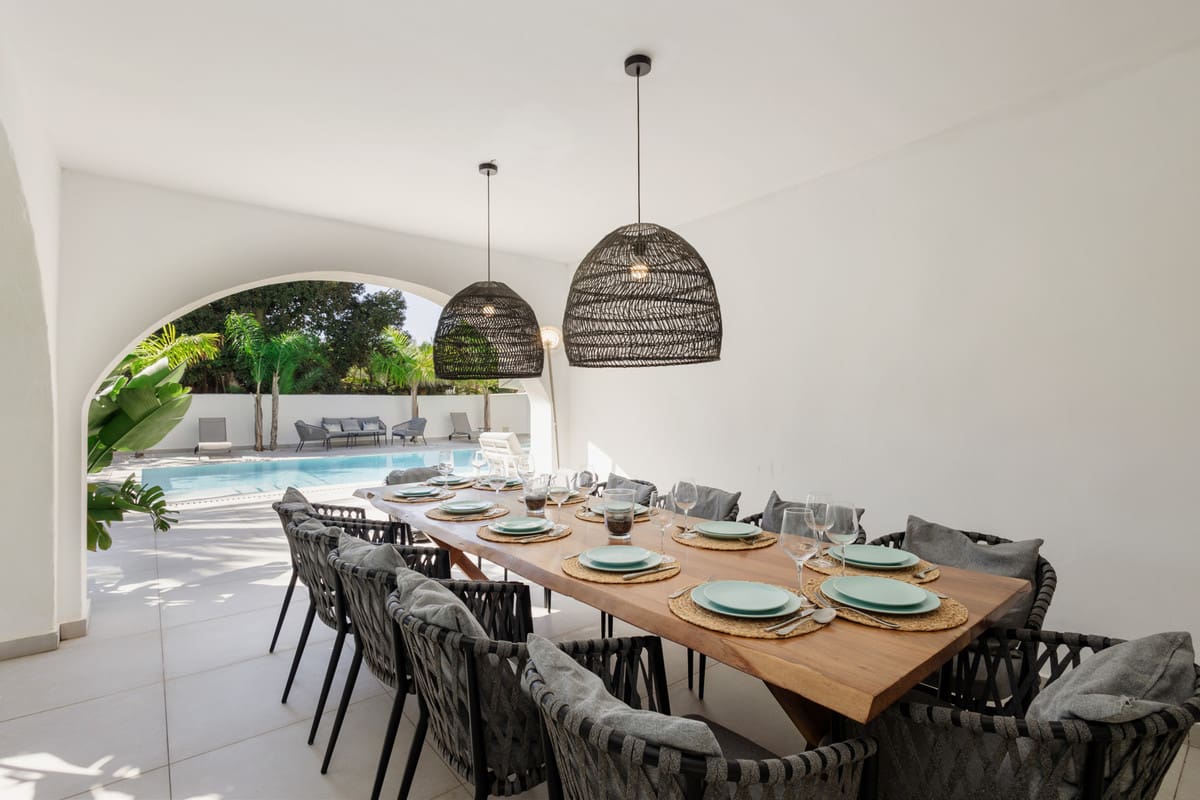 Upon entry, you'll find a 5×20 meter pool with heating option (additional cost), surrounded by sun loungers, umbrellas, and well-maintained gardens. Two chill-out areas with sofas invite you to relax with a cocktail at sunset, while the outdoor dining areas and barbecue zone create the perfect space to share memorable moments.